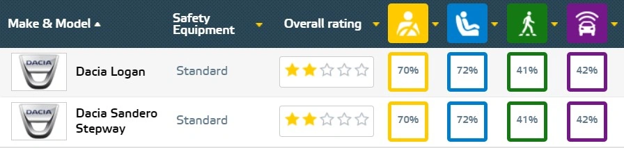 Незважаючи на те, що бюджетні машини змінили платформу і обзавелися розширеним пакетом систем безпеки, показати хороші результати їм не вдалося. Оцінювали авто в шести категоріях: безпека водія і пасажирів, захист пішоходів, бічне і фронтальне перекриття, стійкість до перевороту, міцність даху і ухилення від лобового зіткнення. За підсумками цих випробувань кросовер Сандеро Степвей і седан Логан отримали всього дві зірки з п'яти можливих.