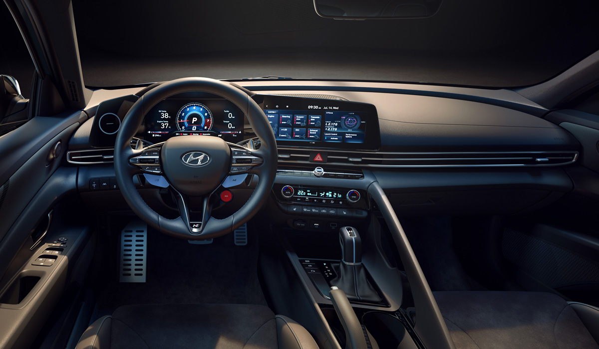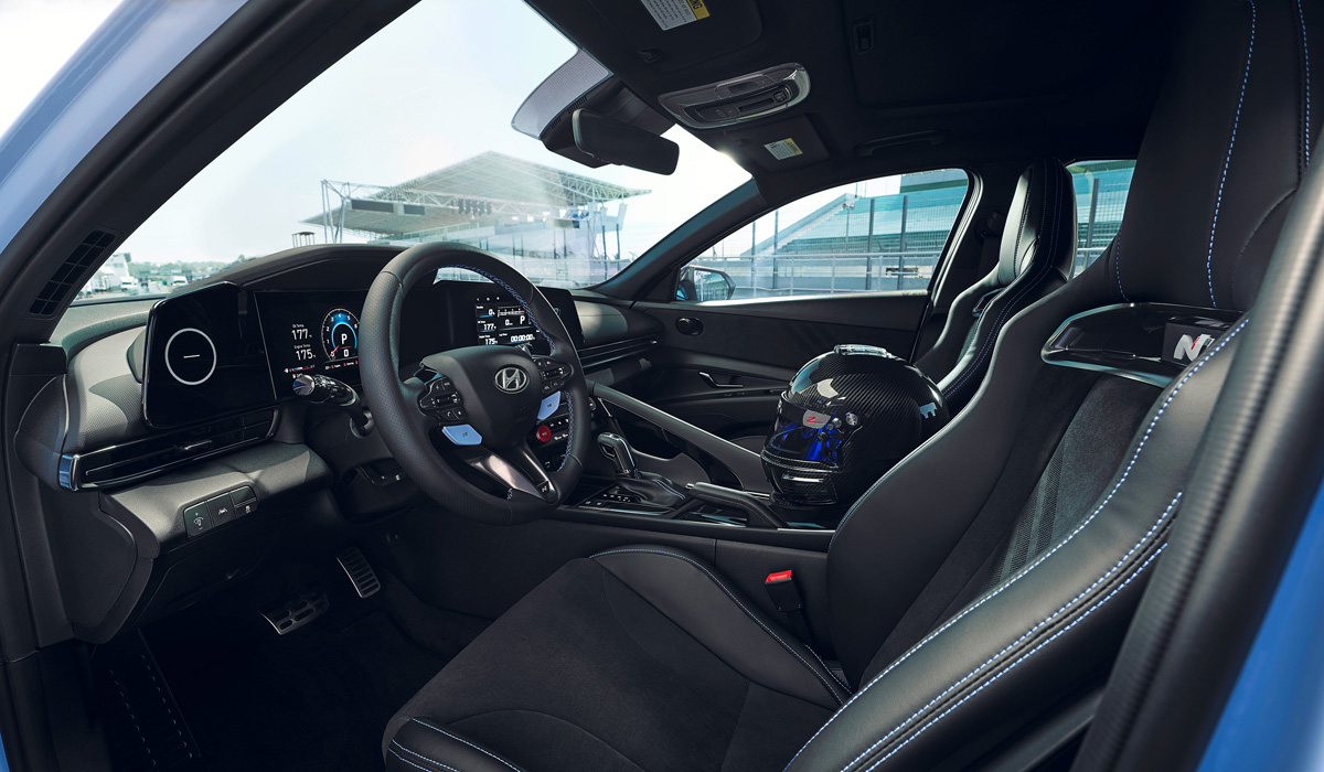 В інтер’єрі спортивний характер Hyundai Elantra N підкреслюють оригінальна цифрова панель приладів, кермове колесо з можливістю вибору режимів їзди і металеві накладки на педалях. Як стандартна опція в салоні встановлені передні сидіння з розвиненою бічною підтримкою, вентиляцією і електрорегулюваннями. За доплату їх замінять легшими спортивними ковшами.