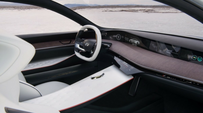 Новый Infiniti Q Inspiration отличается элегантным внешним видом с покатой формой крыши. По-новому решена фирменная решетка радиатора Инфинити, оригинально смотрятся и узкие светодиодные фары. Фонари растянуты на всю ширину задней части.