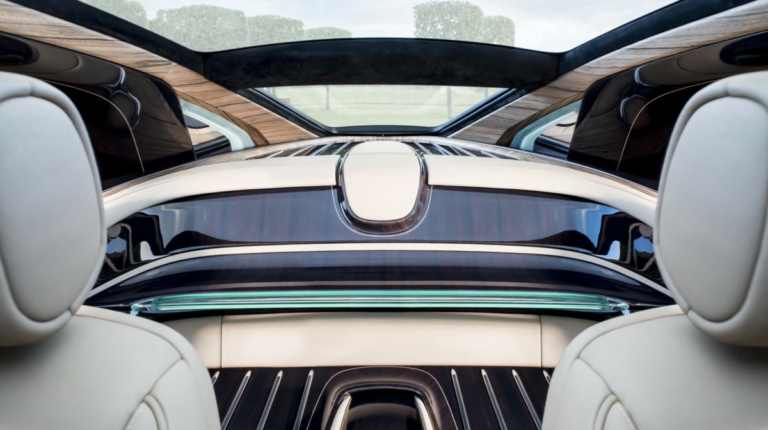 Інтер’єр, як і личить, оздоблено дорогими шкірою та деревом. Дах авто – повністю прозорий.