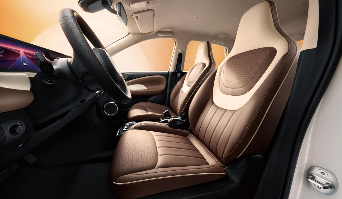 У салоні — двоспицеве кермо у ретро стилі та характерна оббивка сидінь. На передній панелі комплект із двох дисплеїв. Для управління мікрокліматом встановлені три рукоятки, що обертаються, із вбудованими кнопками.