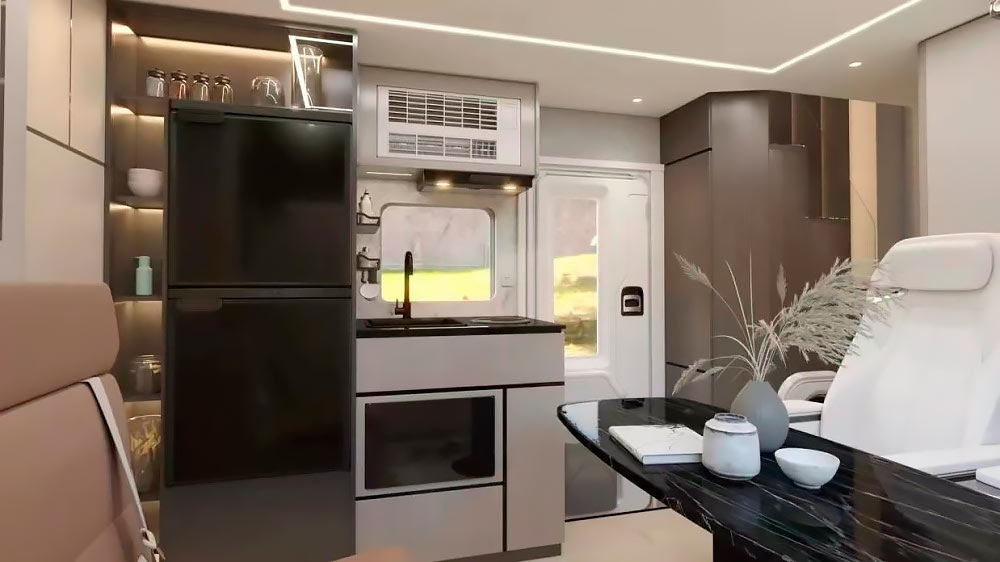 У списку корисних функцій система фільтрації та нагрівання води, кондиціонер, тепла підлога, аудіосистема та набір побутової техніки. Енергією всі ці прилади забезпечує акумулятор ємністю 29 кВт·год, який поповнюється, у тому числі від сонячних панелей, зарядної станції та ДВЗ. На вибір запропоновано кілька варіантів оздоблення інтер’єру.
