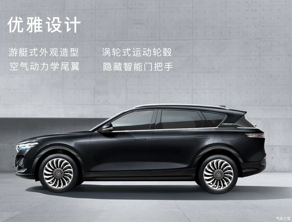 Від базової моделі версія Long Range відрізняється широкою багатокутною решіткою радіатора з хромованими вертикальними ребрами. Впритул до неї розташувалися широкі блоки передньої оптики. На зображеннях автомобіля у профіль привертають увагу потаємні ручки дверей, пофарбовані в колір кузова дверні стійки та багатоспицеві колісні диски діаметром 20 дюймів. Габаритна довжина кросовера — 4905 мм, ширина — 1950 мм, висота — 1645 мм, розмір колісної бази — 2960 мм.