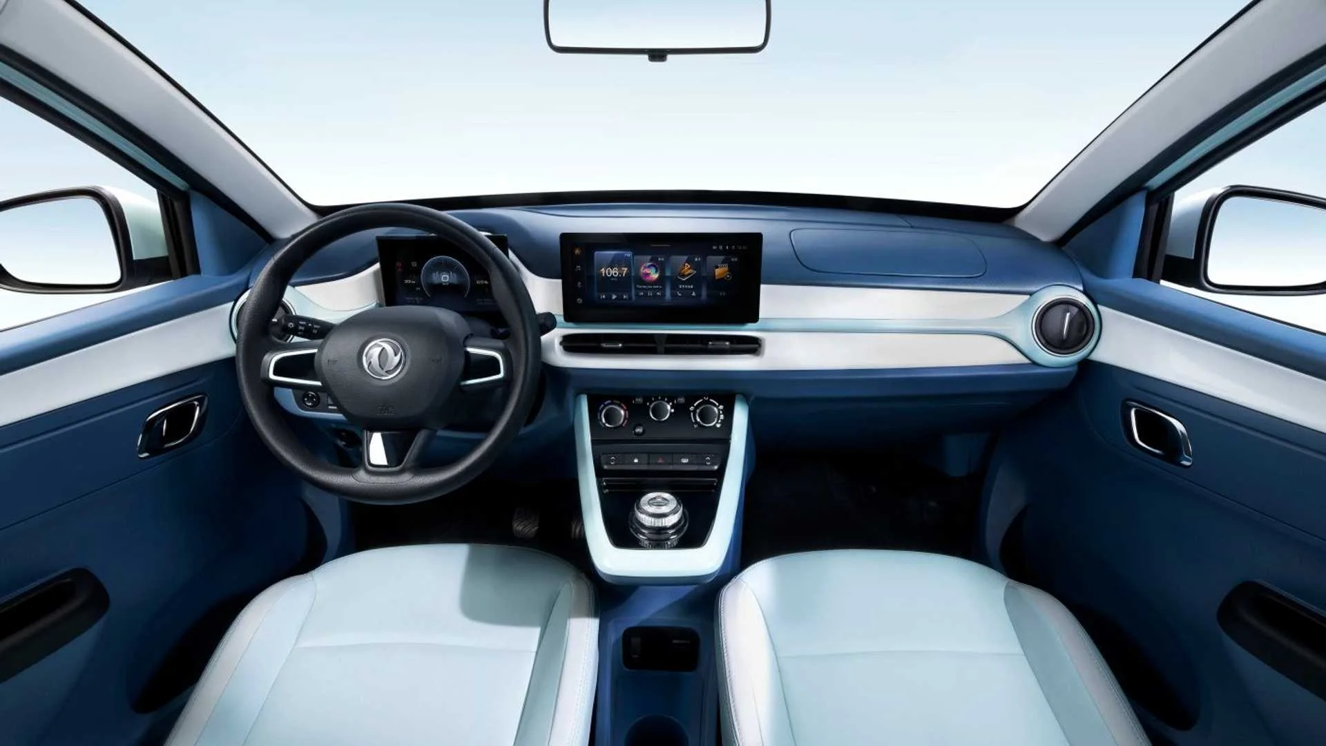 Мятно-зеленый салон электромобиля укомплектован двумя дисплеями: 7,0-дюймовой панелью приборов и 10,0-дюймовым «парящим» экраном мультимедийной системы. Несмотря на то, что управление всеми функциями выведено на экран «мультимедиа», отказываться от физических рукояток отказываться не стали. В том числе вручную настраивается и климатическая система.