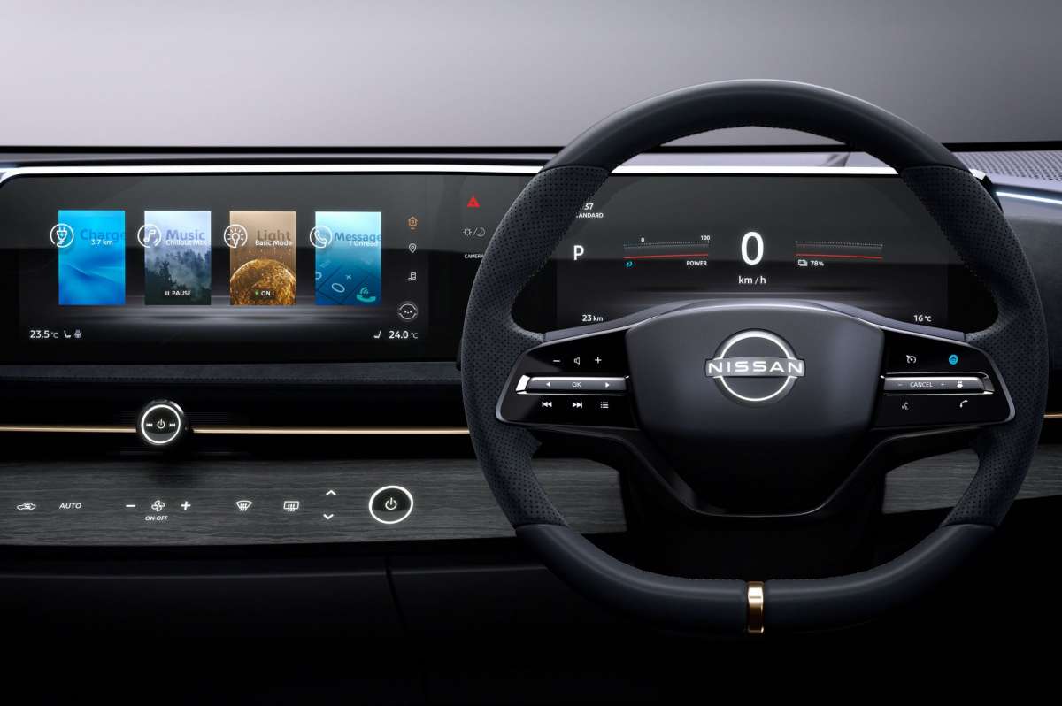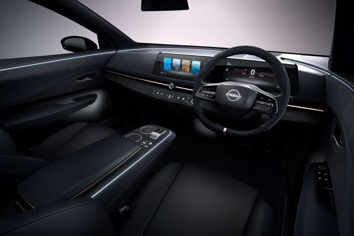 У салоні Nissan Ariya – футуристична приладова панель з двома великими дисплеями і велика сенсорна панель на центральній консолі.