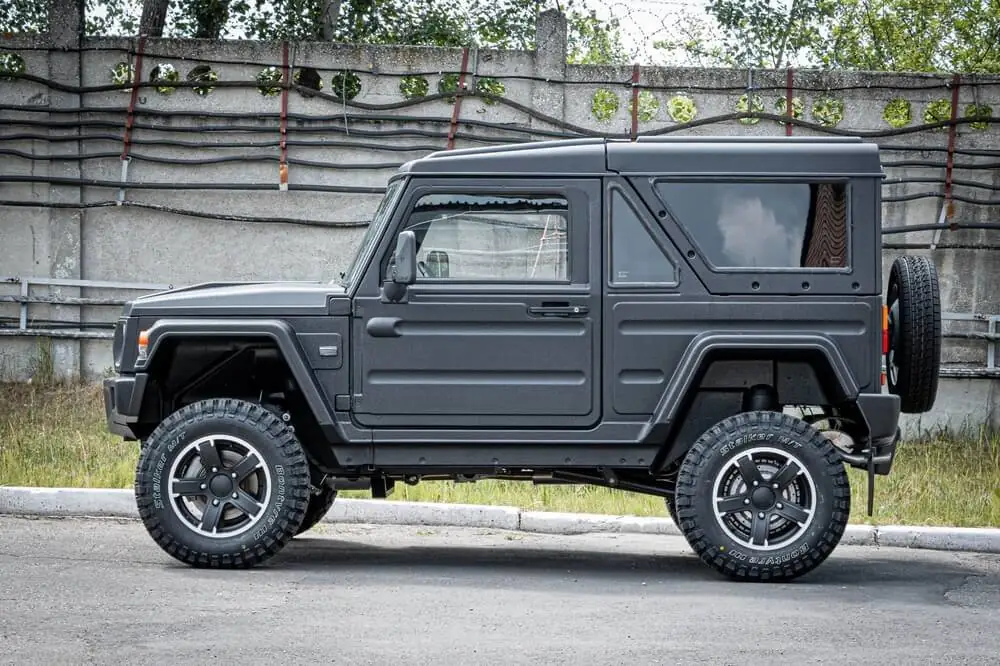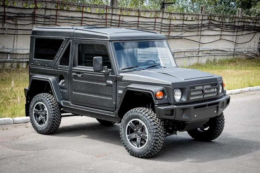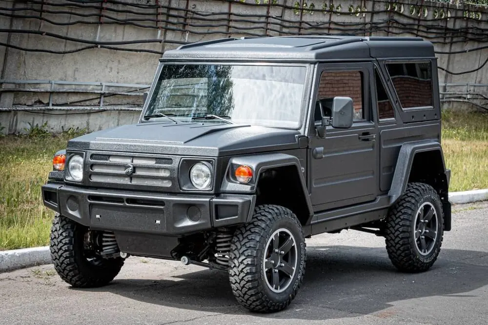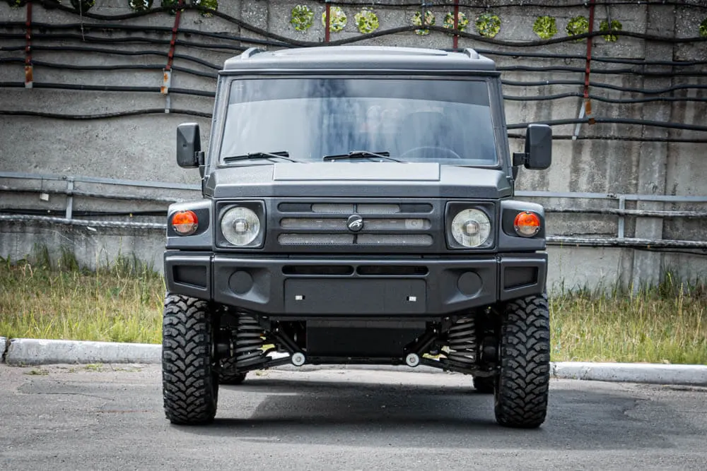 Зовні автомобіль нагадує сплав ЛуАЗу, Mercedes G-class, Land Rover Defender і навіть трішечки Hummer. Загалом схожий на всіх і одразу. Добра новина — на пластикову пляшку майже не схожий, ура.