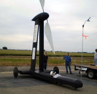 Сверхлегкий одноместный трехколесный болид, который был построен в сотрудничестве с университетом Сан-Хосе, оснащен высокой мачтой, на которой расположен пятиметровый пропеллер. Схема движения ветромобиля такова: изначально ветер толкает сам автомобиль, а кинетическая энергия с колес передается на тяжелый ветряк, тем самым, раскручивая его. После этого, набрав инерцию, пропеллер разгоняет автомобиль, сообщает Autoban.