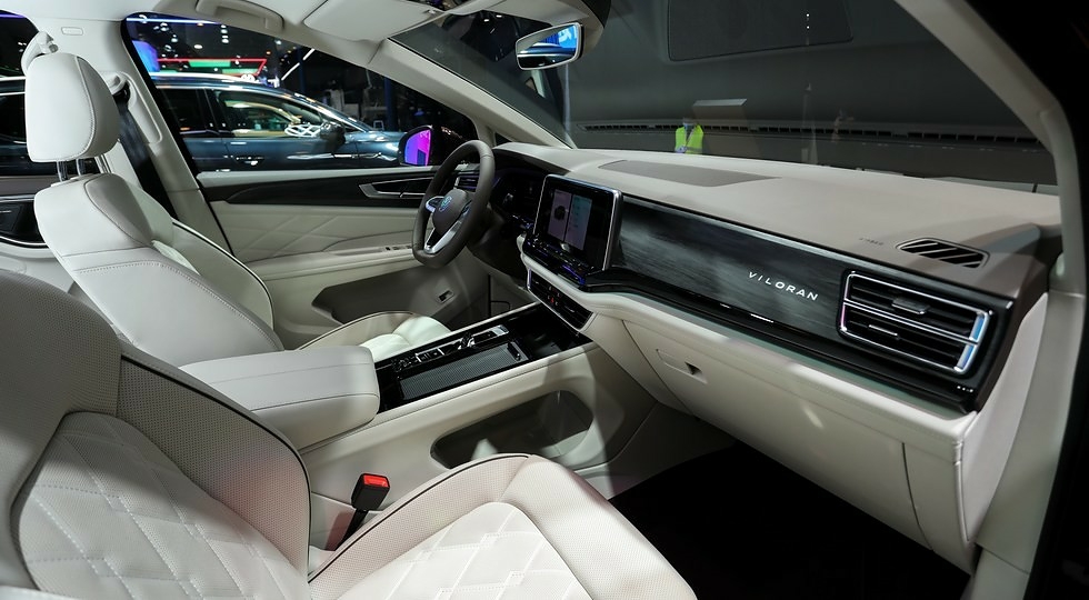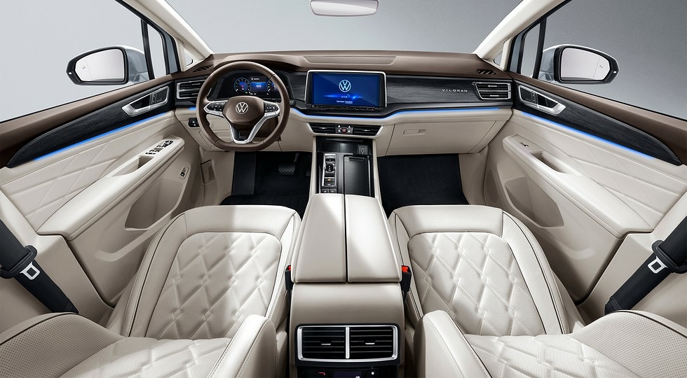 У салоні Volkswagen Viloran без проблем можуть розміститися сім осіб. Крісла встановлені за схемою 2+2+3. У другому ряду за доплату передбачені висувні підніжки, вентиляція і масаж. Також дорожчі комплектації VW Viloran можуть запропонувати цифрову панель приладів, камери кругового огляду, адаптивний круїз-контроль, системи автоматичного гальмування і утримання в смузі руху. Плюс до цього в наявності асистенти руху в заторах і на парковці.