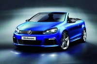 Внешне Golf R кабриолет отличается новыми передними и задними бамперами, боковыми юбками и двумя патрубками выхлопной системы. Салон автомобиля выполнен из натуральной кожи, сочетающей в себе темно-синие и серые оттенки.
