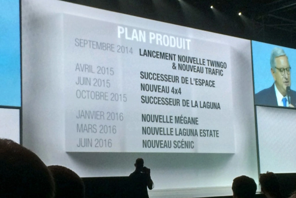 Форумчане сайта Planete Renault опубликовали фотоснимок с закрытой дилерской конференции альянса Renault-Nissan (на заглавном фото), которая состоялась во Франции ещё в июне. Таким образом, обнародован расписанный до 2016 года план по выпуску новинок французской марки. На первой строчке рассекреченного плана — сентябрь 2014 года, когда начнутся глобальные продажи хэтчбека Renault Twingo третьего поколения и выйдет в свет следующая генерация минивена Renault Trafic.
