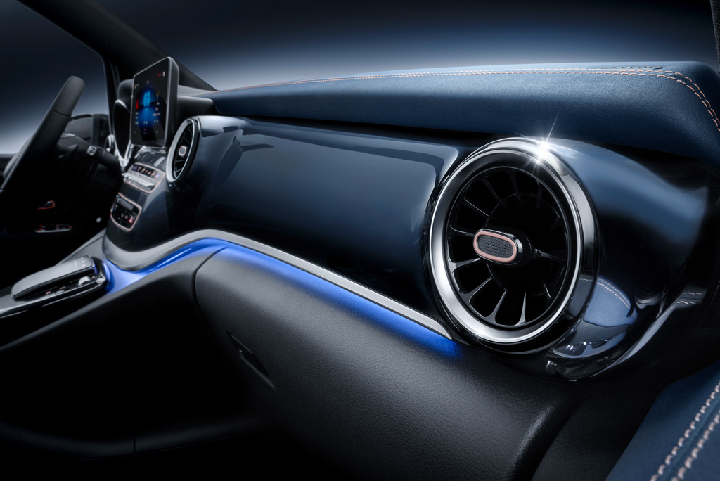 Подлокотники и сиденья отделаны кожей nappa синего цвета с золотисто-розовой прострочкой. Кроме того, обивка подушек сидений из кожи nappa черного цвета и элементы темно-синего цвета на спинках сидений вносят разнообразие в цветовую палитру.