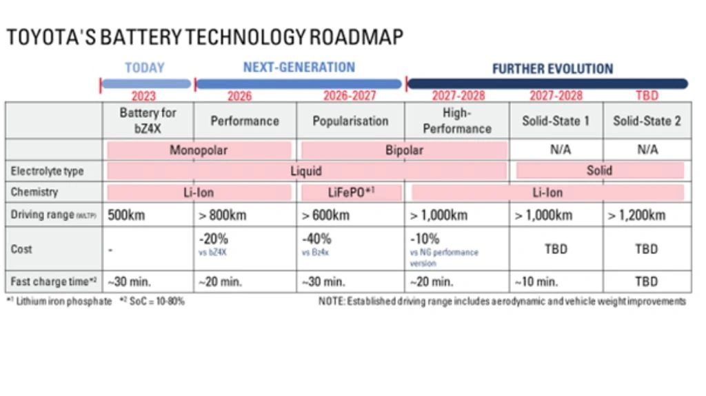 Випускатись електромобілі з новими батареями почнуть у 2027-2028 роках. Повідомляється, що компанія використовуватиме в новинках чотири типи батарей: три з рідким електролітом і один - з твердим. Акумулятор Performance з літій-іонним хімічним складом дебютує на Toyota BEV у 2026 році і забезпечить пробіг до 800 км.