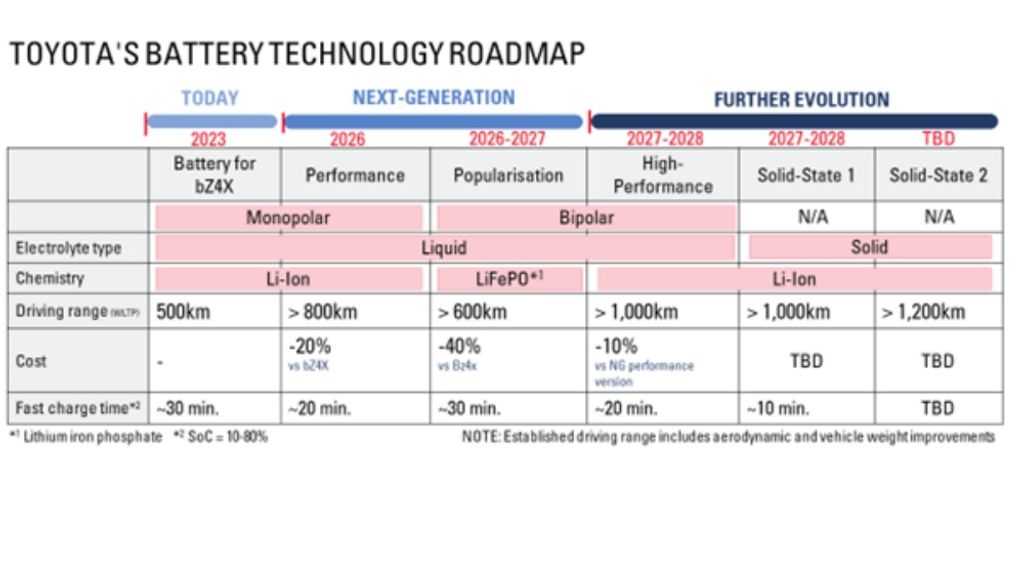Випускатись електромобілі з новими батареями почнуть у 2027-2028 роках. Повідомляється, що компанія використовуватиме в новинках чотири типи батарей: три з рідким електролітом і один – з твердим. Акумулятор Performance з літій-іонним хімічним складом дебютує на Toyota BEV у 2026 році і забезпечить пробіг до 800 км.