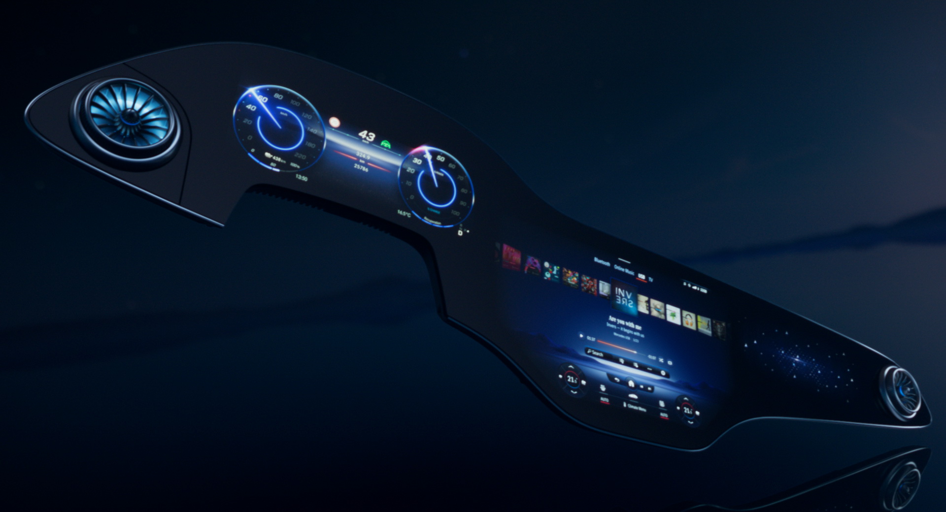 Изогнутый гиперэкран состоит из трех отдельных дисплеев, заключенных под единое стекло, и простирается почти во всю ширину передней панели. Один из дисплеев предназначен для переднего пассажира, два других адресованы водителю. Диагональ экрана составляет 56 дюймов, что делает его самым большим из ныне существующих в автопроме. Несмотря на визуальную монолитность, элемент имеет пять технологических разрывов, которые продуманы в целях безопасности. Все они сосредоточены в боковых частях и возле дефлекторов, а вот экранная доля – цельная и изготовлена из закаленного стекла.