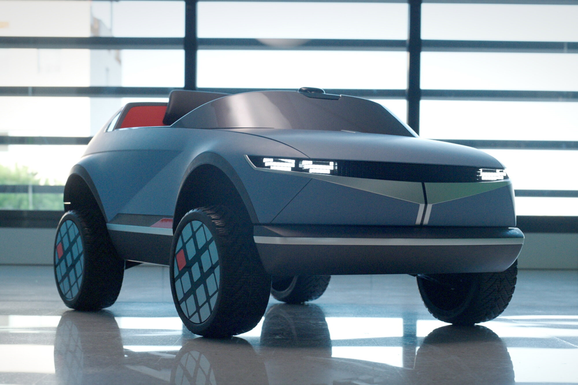 Новий електромобіль має доволі яскраву зовнішність, яка відсилає до Hyundai 45, представленого минулого року. Йому зберегли характерний незграбний кузов, оригінальні виштамповки і тонкі фари. Автомобіль пофарбували в стильний колір Performance Bbue і доповнили його помаранчевими акцентами. У центрі кабіни встановлено одне крісло. Таке рішення проводить паралель зі світом автоспорту.