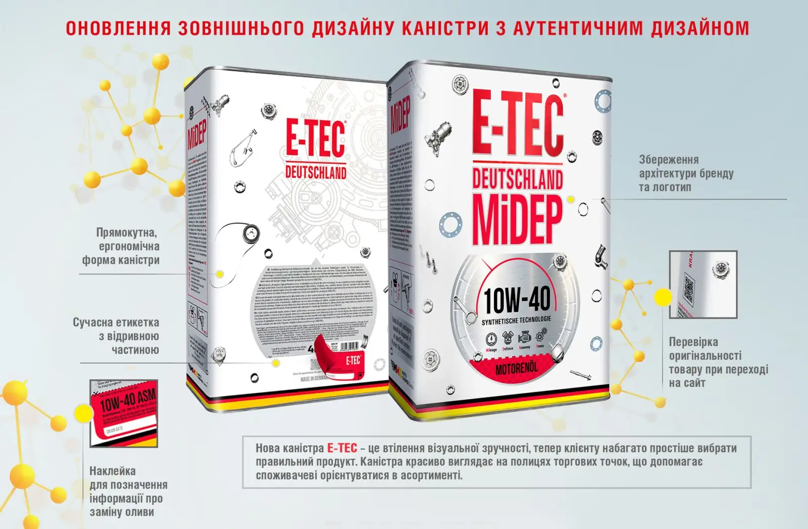 Змінився дизайн 1 і 4 літрових металевих каністр моторних і трансмісійних олив Е-ТЕС. Каністра бренду Е-ТЕС – втілена ідея комфортного і зрозумілого вибору продукції. На нових каністрах додатковим елементом стала етикетка, виконана у вигляді спідометра з інформацією про продукцію. Передбачена відривна етикетка-трансформер, яка є підкапотним інформаційним стікером при заміні оливи. Нововведення покликані зробити інформацію про продукти більш наочною і полегшити автовласникам правильний підбір оливи.