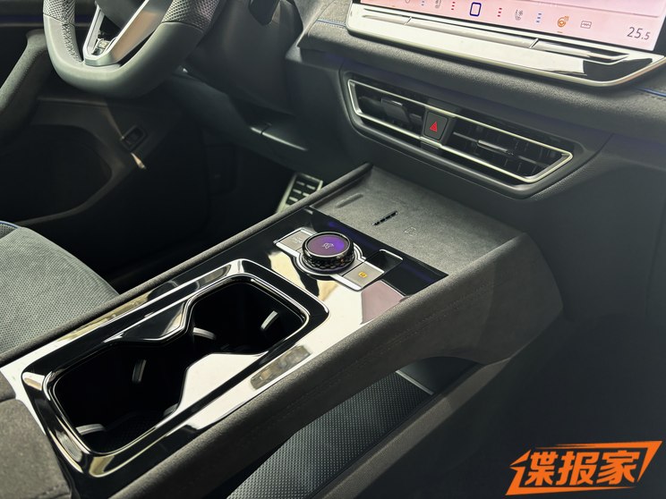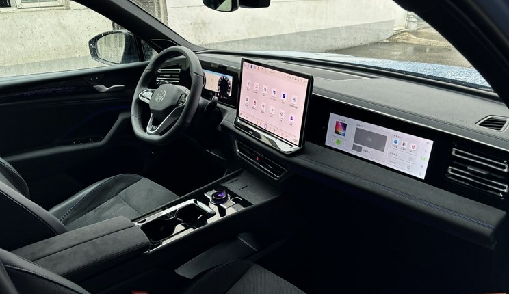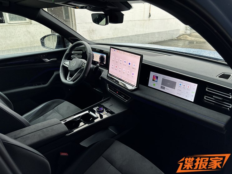 Шпигуни заглянули і до салону подовженого Tiguan. Загальний дизайн версії R-Line підкреслює спортивність та авангардність. Крім цифрової панелі приладів і великого екрана мультимедії в оснащенні увійшов ще й окремий для переднього пасажира.