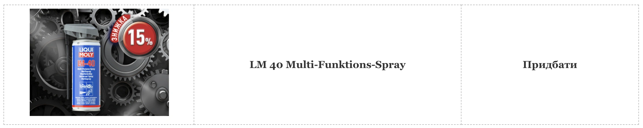 З 18.03.2024 по 21.04.2024 мультиспрей LIQUI MOLY LM-40 можна купити в Україні зі знижкою 15%. Придбати акційний товар можна в інтернет-магазинах, на полицях гіпермаркетів та АЗК, а також у авторизованих продавців (з повним переліком точок продажу можна ознайомитись на офіційному сайті https://liquimoly.ua/).