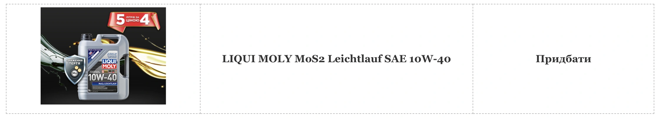 Навіть якщо у вас за планом заміна оливи за місяць-другий, скористатися акційною пропозицією 5 л за ціною 4 л зараз буде виправдано, тому що гривня у нас «дешевшає», а ціни збільшуються з кожним місяцем. Так, під час дії акції п'ятилітрову каністру моторної оливи LIQUI MOLY MoS2 Leichtlauf SAE 10W-40 можна придбати за ціною чотирьохлітрової. Фірмова особливість цієї оливи - наявність у її складовій дисульфіду молібдену, який відмінно захищає деталі двигуна від зносу.