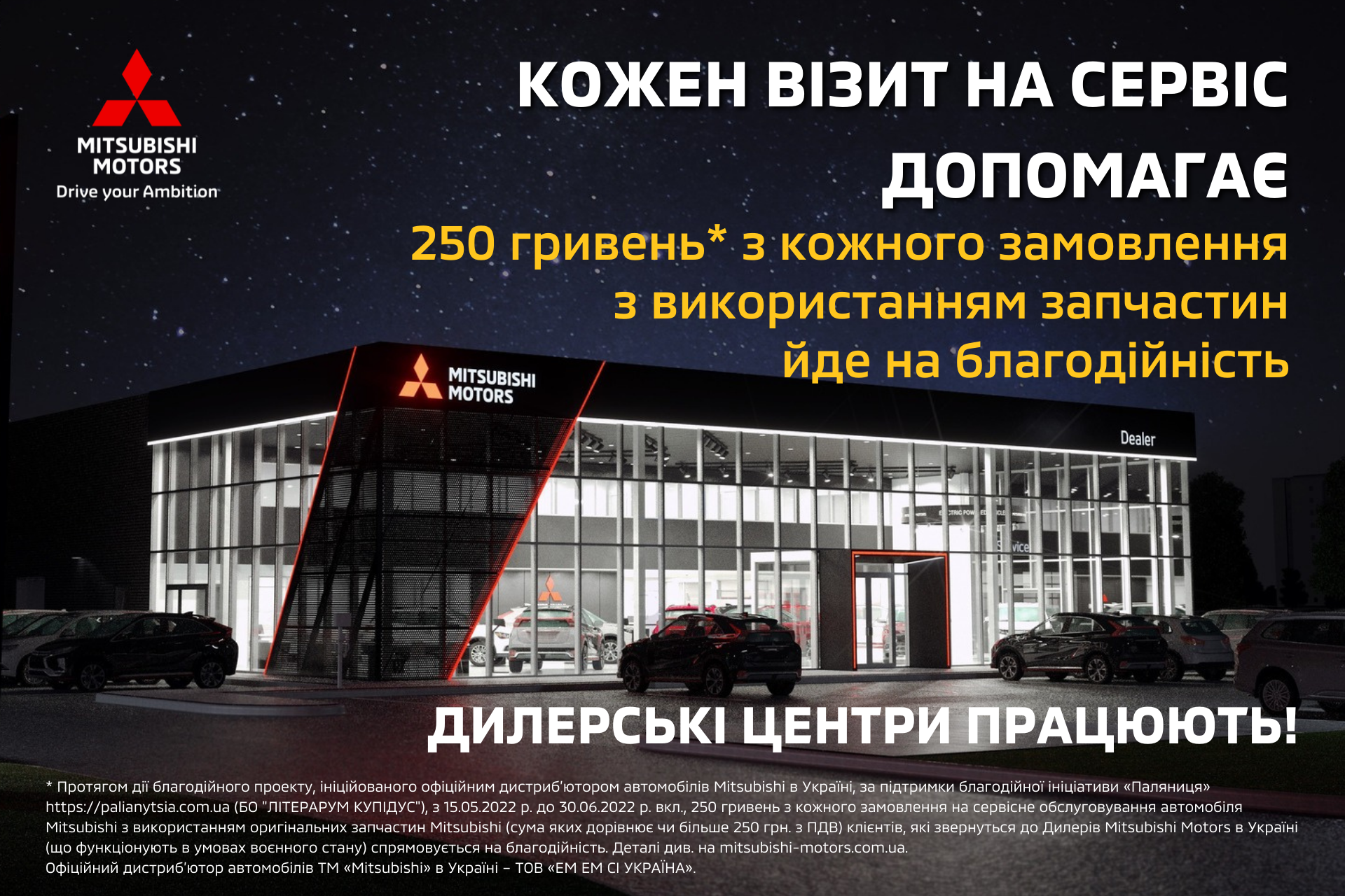 Починаючи з 15 травня до 30 червня 2022 року включно, 250 гривень з кожного замовлення на сервісне обслуговування автомобіля ТМ «Mitsubishi» з використанням оригінальних запчастин Mitsubishi** в офіційній дилерській мережі Mitsubishi Motors в Україні буде спрямовано на допомогу постраждалим від війни. Таким чином, у межах цього благодійного проєкту компанія «ЕМ ЕМ СІ УКРАЇНА» пожертвує близько 50% прибутку (як очікується) від напрямку післяпродажного обслуговування, і це дозволить зібрати до 2 мільйонів* гривень допомоги за період дії вказаного проєкту (травень-червень 2022 р.).