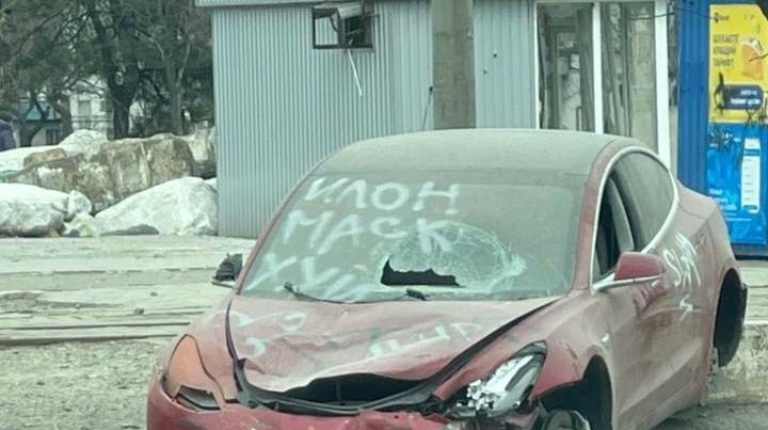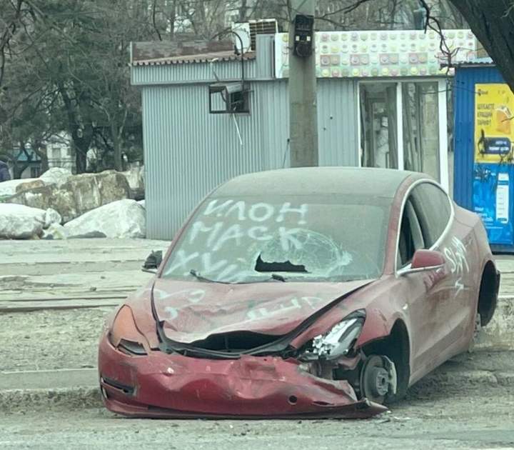 Ставшая героем нескольких сюжетов Tesla Model 3, которой удалось уцелеть в Мариуполе, также привлекла внимание мародеров из страны-агрессора. Так как завести электрокар не удалось, они просто разбили его и написали нецензурное послание Илону Маску.