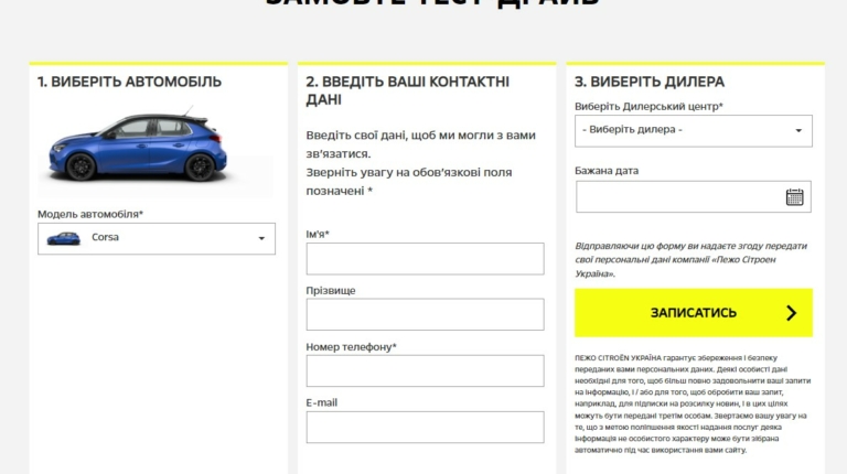 При цьому деякі онлайн-функції вже давно працюють, щоб спростити життя для потенційних і існуючих клієнтів Бренду. Так, завдяки простій формі, ви можете легко записатися на тест-драйв автомобіля вашої мрії. Все досить просто – переходьте на сторінку запису на тест-драйв, вибирайте бажаний автомобіль, заповніть графу з вашими даними, щоб дилер міг з вами зв’язатись для підтвердження, і нарешті вибирайте найближчого до вас дилера з великого списку дилерської мережі Бренда Opel – і все що залишилося зробити, це прийти у призначений час для вашого персонального тест- драйву.