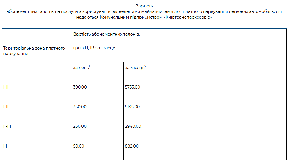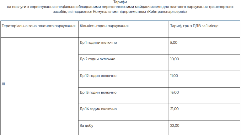 В Киеве огромное количество парковок, большая часть из которых платные. Стоимость паркоместа зависит от района города. Чем дальше от центра столицы, тем дешевле. В настоящее время цена варьируется от 5 до 10 гривен за один час. Первые 10 минут простоя – бесплатные.