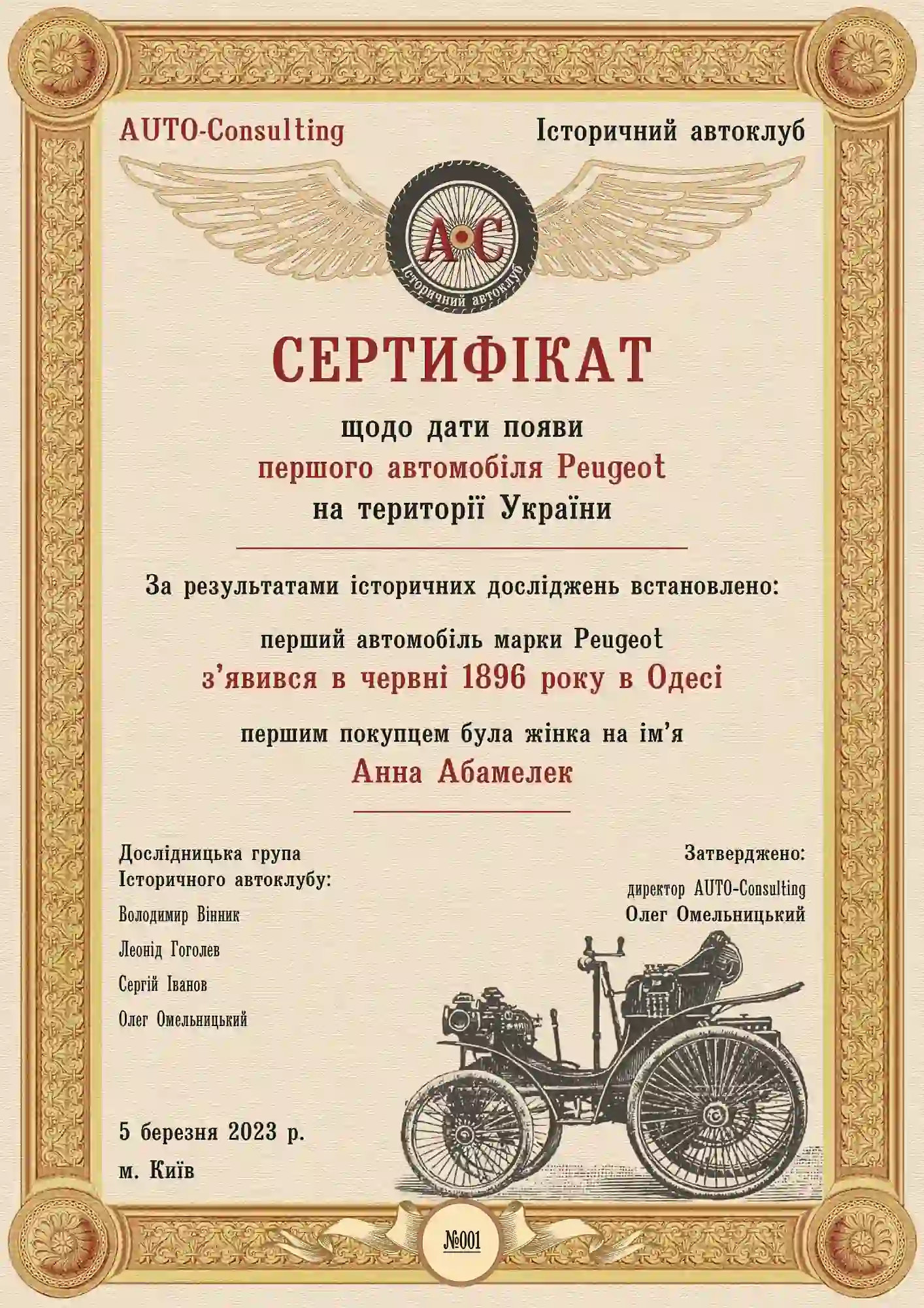Завдяки комплексному та глибокому дослідженню AUTO-Consulting із залученням фахівців Історичного Автоклубу (В. Винник, Л. Гоголев, С. Іванов) вдалося встановити, що перший автомобіль Бренду PEUGEOT з’явився в Україні в 1896 році. Власницею даного автомобіля стала княгиня Анна Абамелек, яка також стала першою жінкою, що придбала автомобіль в Україні. Анна обрала для себе модель PEUGEOT Type 11, випуск якого розпочався тільки у 1895 році і загалом було випущено всього 27 екземплярів. Даний автомобіль представляв собою 2х місну карету з бензиновим двигуном позаду від компанії Daimler. PEUGEOT Type 11 оснащувався двигуном, який мав 2 циліндри та об’єм 1,6 літри. Привід автомобіля був задній з цепною передачею.