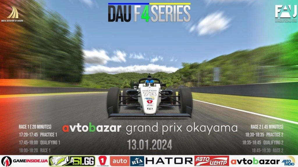 Комісія Цифрового Автоспорту запрошує на Перший етап AVTOBAZAR RACE OKAYAMA Міжнародної Серії змагань на Формулах-4 під назвою DIGITAL AUTOSPORT OF UKRAINE: F4 Series-2024. Season 1 (DAU F4 Series) на симуляторі iRacing.