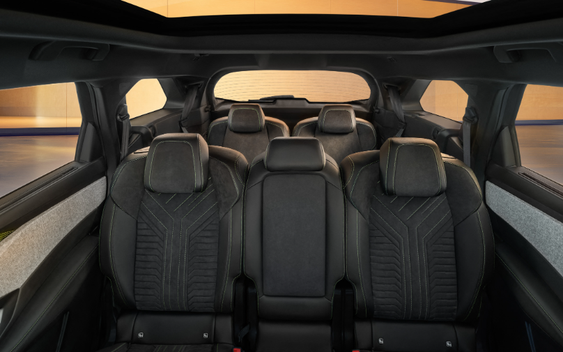 Оснащення салону новинки майже не відрізняється від соплатформенного E-3008. У нього увійшов 21-дюймовий вигнутий екран, який поєднує в собі цифрову панель приладів і мультимедійну систему. Є усічене рульове колесо, сидіння з електроприводом та функцією підігріву, кнопки швидкого доступу i-Toggles, слот для бездротової зарядки смартфона, фонове освітлення, безключовий доступ та адаптивний круїз-контроль. Оздоблення кабіни виконано зі шкіри та алькантари.
