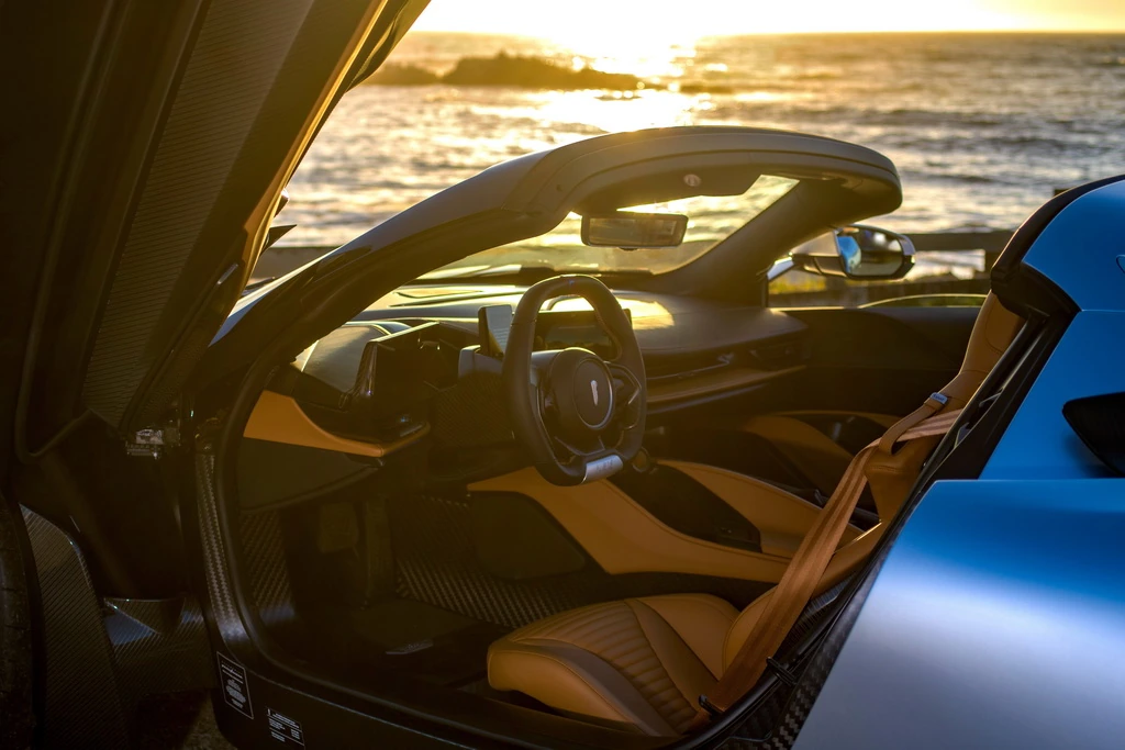 Смужки Iconica Blu під заднім крилом було намальовано вручну. Ще один особливий штрих – унікальні керамічні поліровані литі диски з чорними анодованими алюмінієвими центральними ковпаками та п'ятиспицевим дизайном.