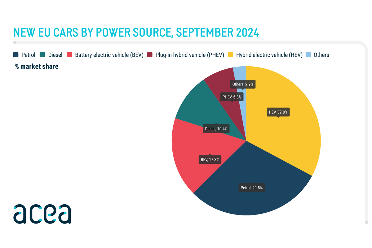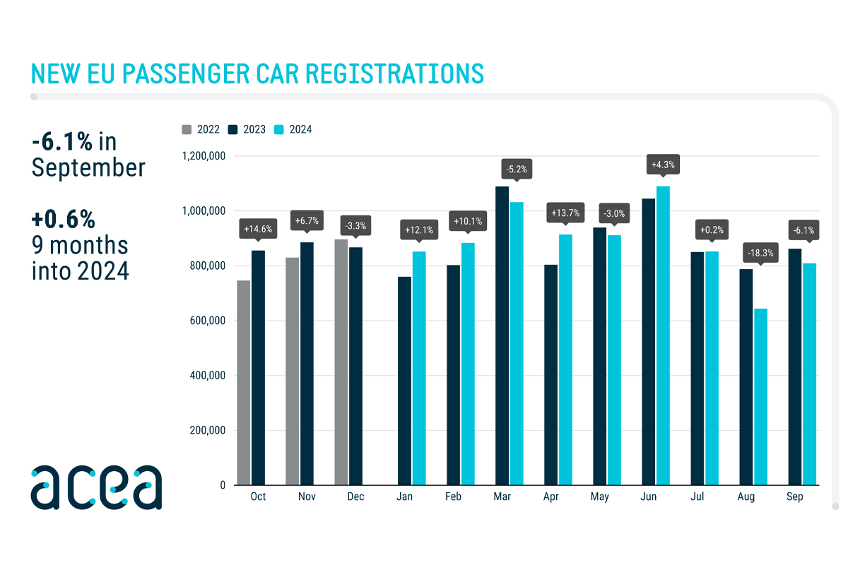 У вересні 2024 року реєстрація нових автомобілів у країнах ЄС скоротилася на 6,1%. Зокрема, зниження купівельної активності спостерігалося на таких важливих ринках, як Франція (-11,1%), Італія (-10,7%) та Німеччина (7%). З чотирьох основних ринків лише Іспанії було зафіксовано зростання продажу нових авто (+6,3%).