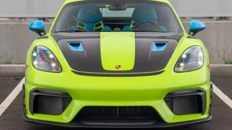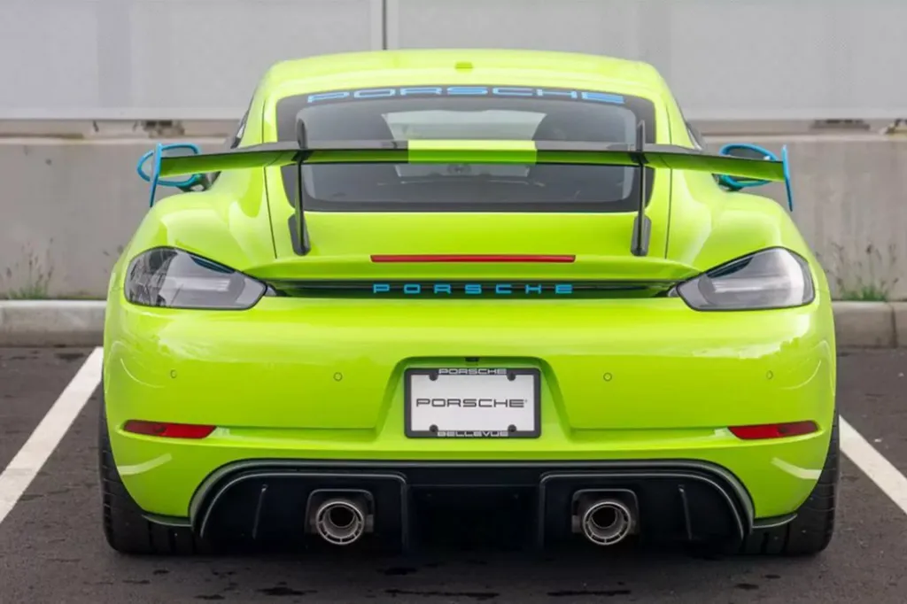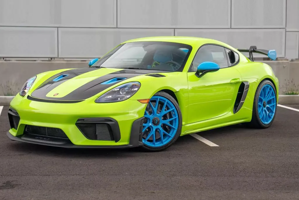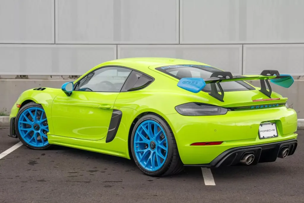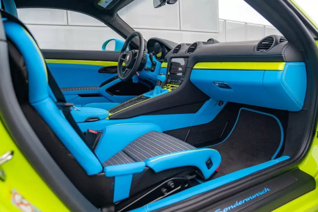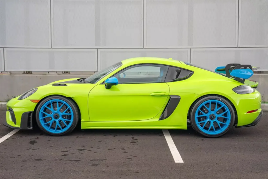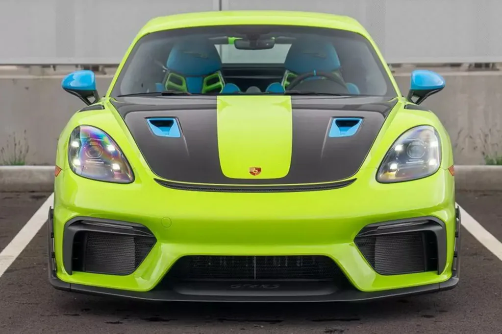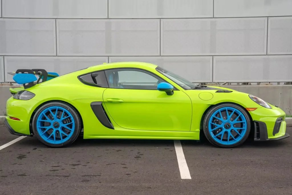 Цей GT4 RS, виставлений на продаж компанією Porsche Bellevue у Вашингтоні, має досить незвичайний вигляд. Очевидно, перший власник хотів автомобіль, який би виділявся в дорожньому потоці. Кузов Cayman пофарбований у яскраво-зелений відтінок, а колісні диски, дзеркала, накладки на заднє антикрило та повітрозабірники NACA на капоті пофарбовані у синій колір. Навіть напис Porsche на задній частині виконаний синім кольором.