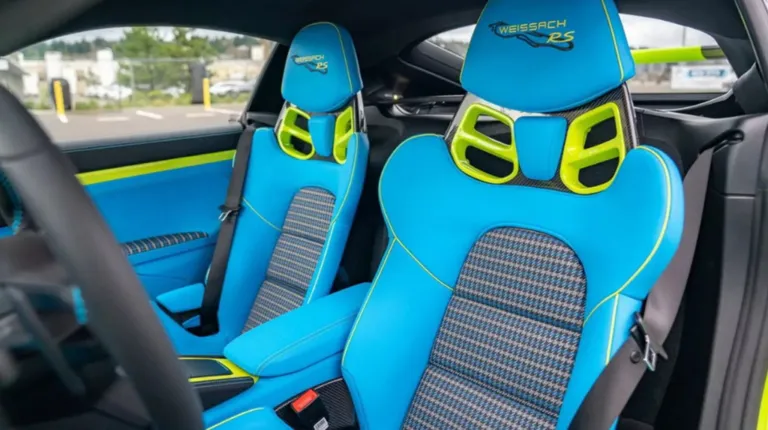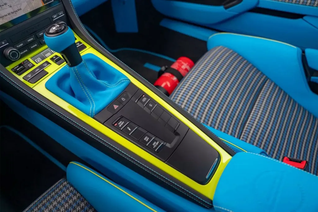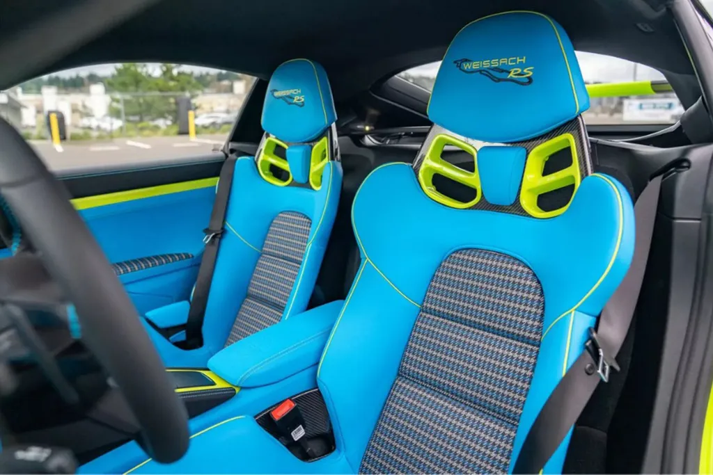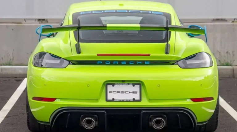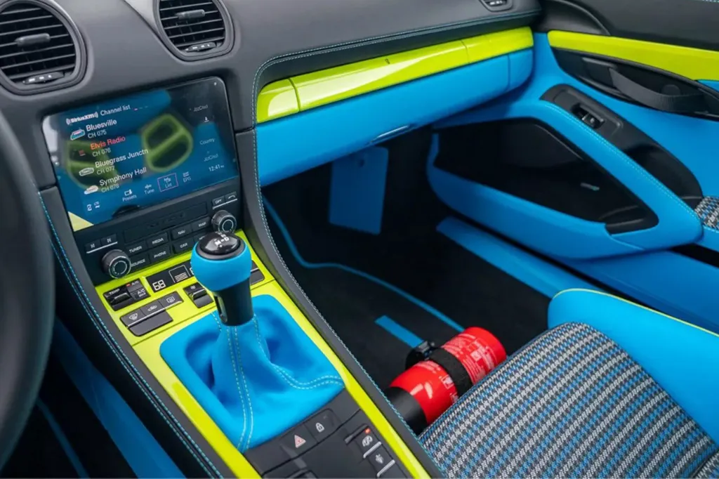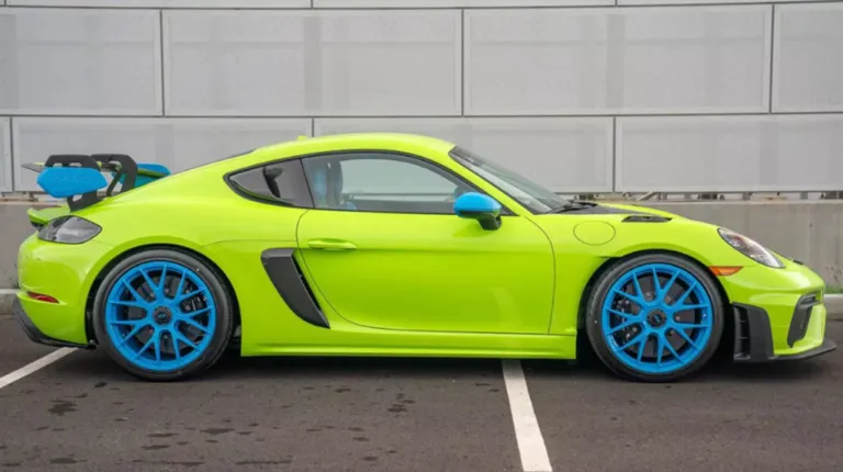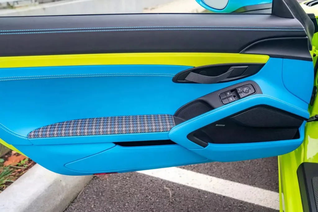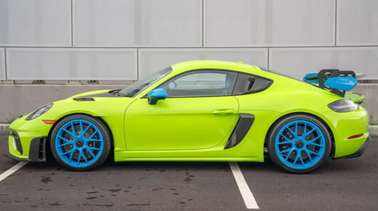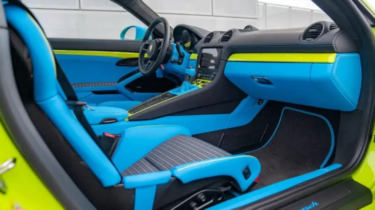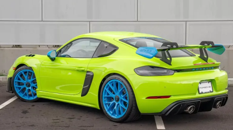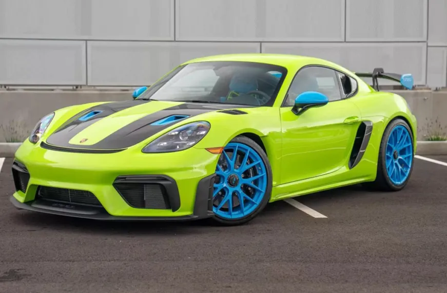Цей GT4 RS, виставлений на продаж компанією Porsche Bellevue у Вашингтоні, має досить незвичайний вигляд. Очевидно, перший власник хотів автомобіль, який би виділявся в дорожньому потоці. Кузов Cayman пофарбований у яскраво-зелений відтінок, а колісні диски, дзеркала, накладки на заднє антикрило та повітрозабірники NACA на капоті пофарбовані у синій колір. Навіть напис Porsche на задній частині виконаний синім кольором.