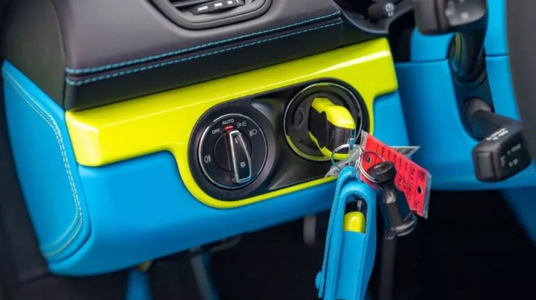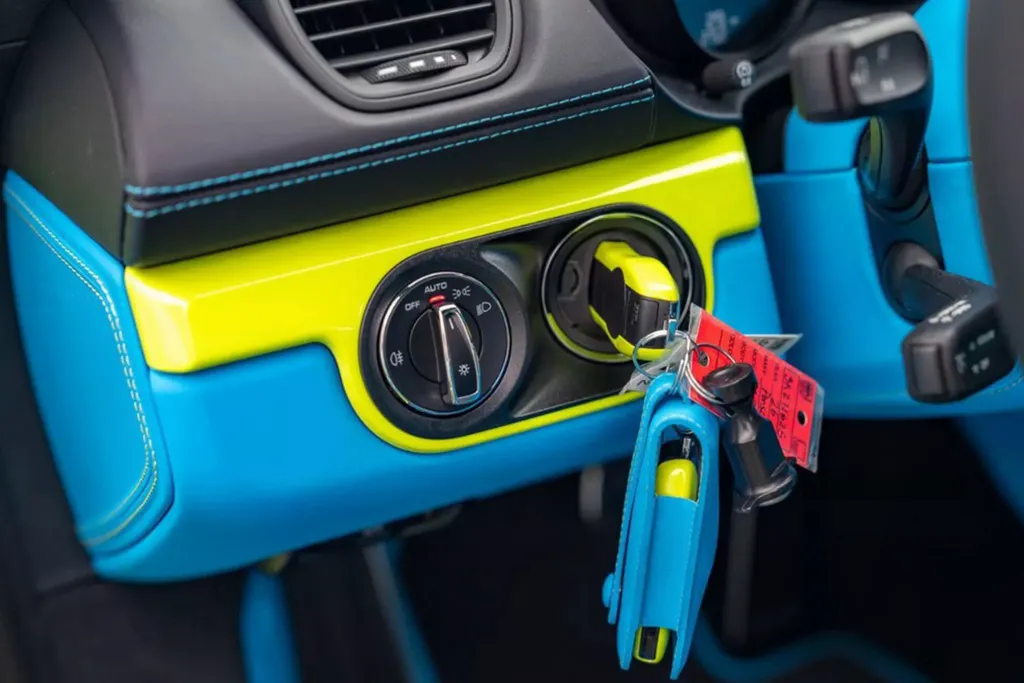 Не менш екстравагантно виглядає інтер’єр машини. Бічні подушки та підголів’я сидінь оздоблені синьою шкірою того ж кольору, що й дверні панелі, а також нижня половина панелі приладів. Пофарбована в зелений колір оздоблення присутня на панелі приладів, трансмісійному тунелі, дверних панелях і навіть усередині сидінь, підкреслюючи окантовку з майже театральним розмахом. Також присутні тканинні вставки на сидіннях, вставки з чорної шкіри та синій контрастний рядок, який пов’язує все воєдино.