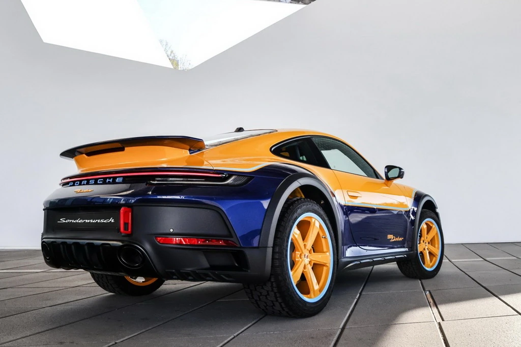 Безперечно, найяскравішим елементом цього 911 Dakar є особлива ліврея у кольорах спонсорського бренду Rothmans, що поєднує яскраво-жовтий Signal Yellow та насичений темно-синій Gentian Blue Metallic. Для більшої оригінальності палітру доповнили блакитним відтінком Lampedeusa Blue, який використовується для тонких ліній на кузові, зовнішніх колах колісних дисків та на окладах фар. Кузов автомобіля був повністю забарвлений вручну. Захисні елементи кузова, які на інших екземплярах виконані з нержавіючої сталі, на цій машині пофарбували у чорний колір.