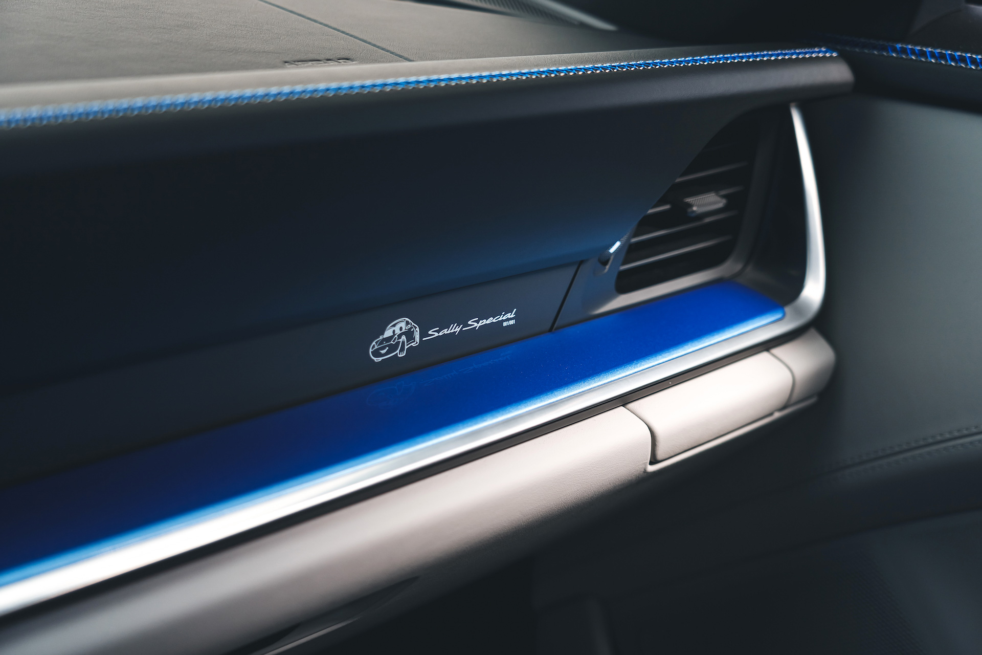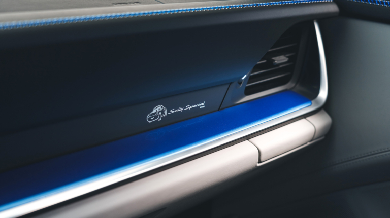 В оздобленні салону використані матеріали аналогічного відтінку, який чудово поєднується із базовими матеріалами. Також є логотипи «Sally Carrera» на задньому склі і «Cars» на дверних картах. На передній панелі зроблено гравіювання «Sally Special 001/001», яке вказує на те, що купе зроблено в єдиному екземплярі.