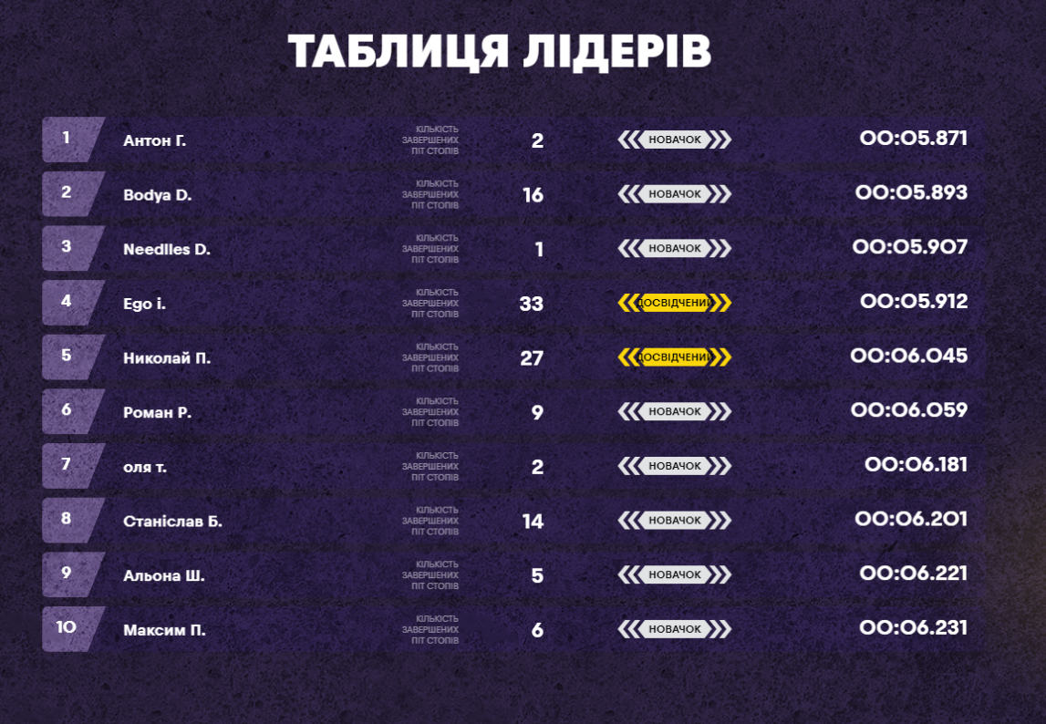 Станом на 13 жовтня гравець на ім’я Антон Г. є лідером з результатом 5,871 с, якого він досяг лише за 2 піт-стопи. На другому місці Bodya D. – 5,893 с та 16-ть спроб. Гравець Needlles D., який зареєстрував лише одну спробу, на третій позиції з результатом 5,907 с. Є ігрок-рекордсмен по кількості піт-стопів, який здійснив 64 спроби. На сьогодні учасниками онлайн-змагань було здійснено 47 561 піт-стоп на сайті.