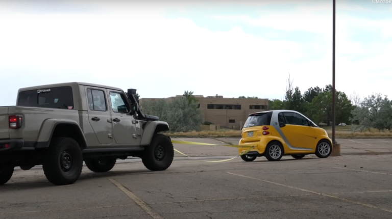 Ось такий скромний Smart вивели на випробування з буксирування. Поруч із потужними пікапами, які йому і належало буксирувати, він і справді був крихіткою, і експеримент здавався свідомо провальним. Однак уже з першої хвилини відео стає зрозуміло, що всі явно недооцінювали цей маленький електромобіль Смарт, адже він з легкістю потягнув важкий Jeep Gladiator.