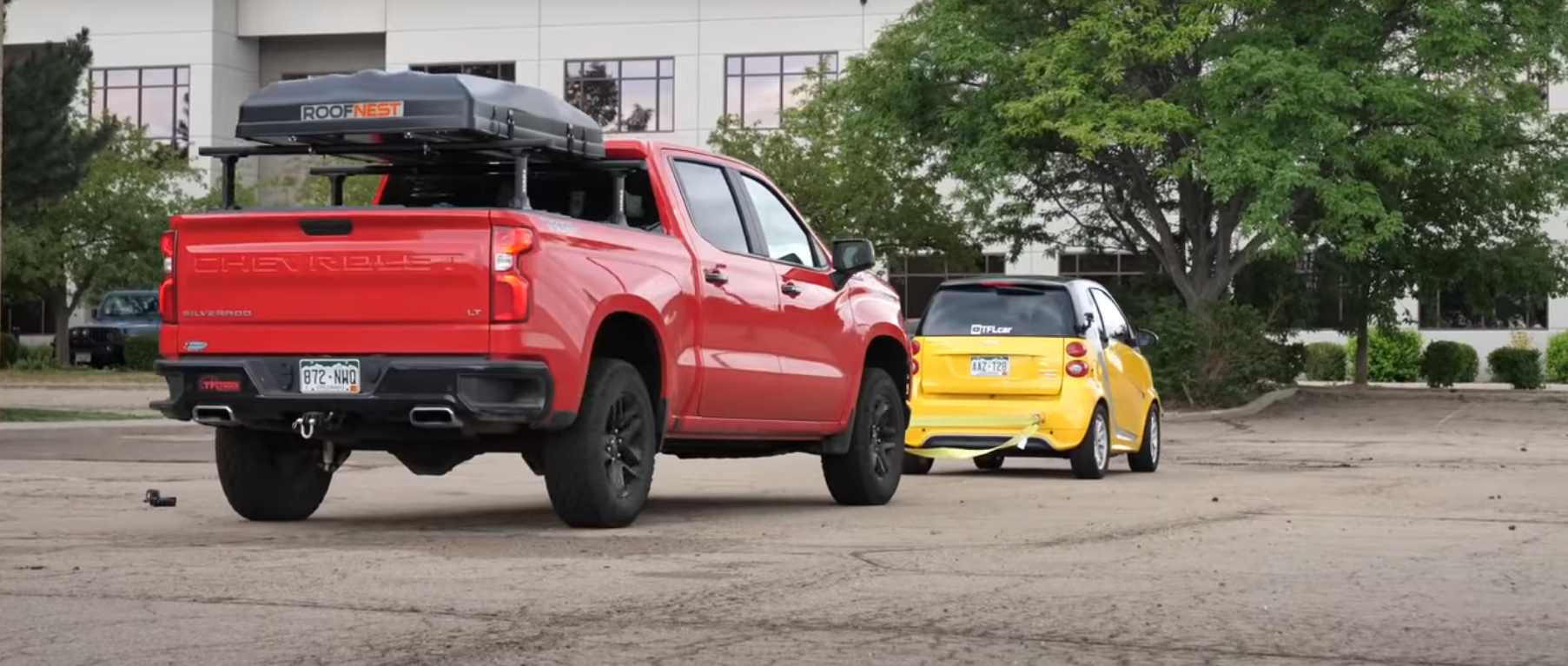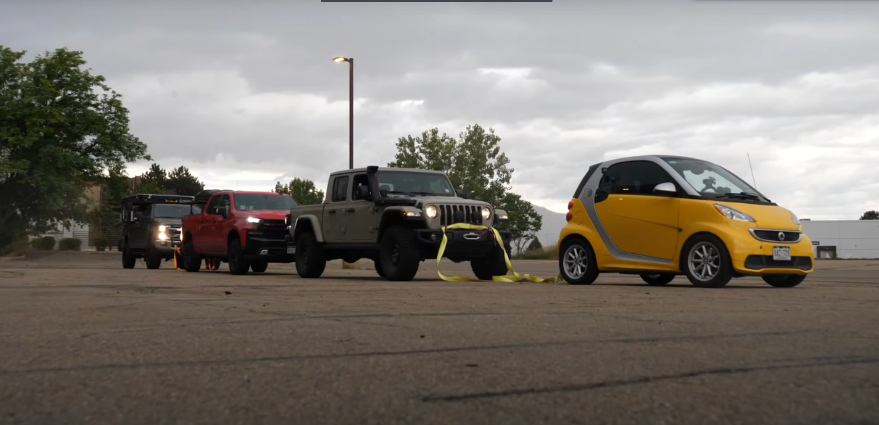 Погляньте, як електричний Smart буксирує три потужних пікапи (відео)