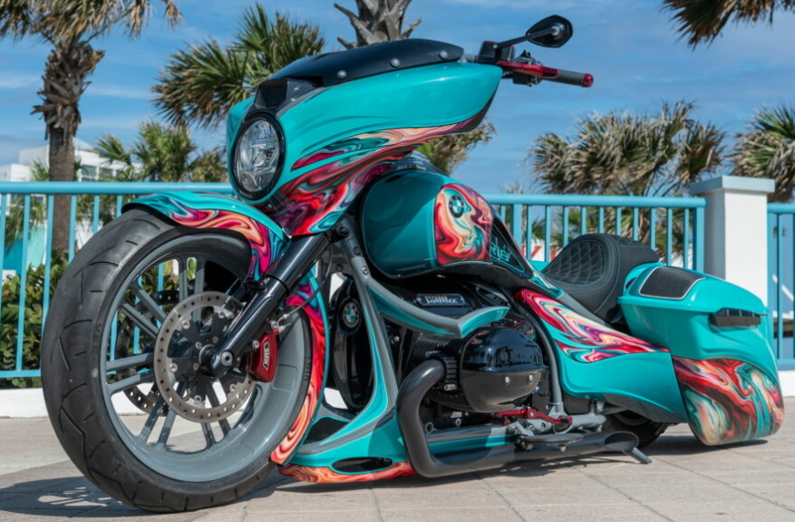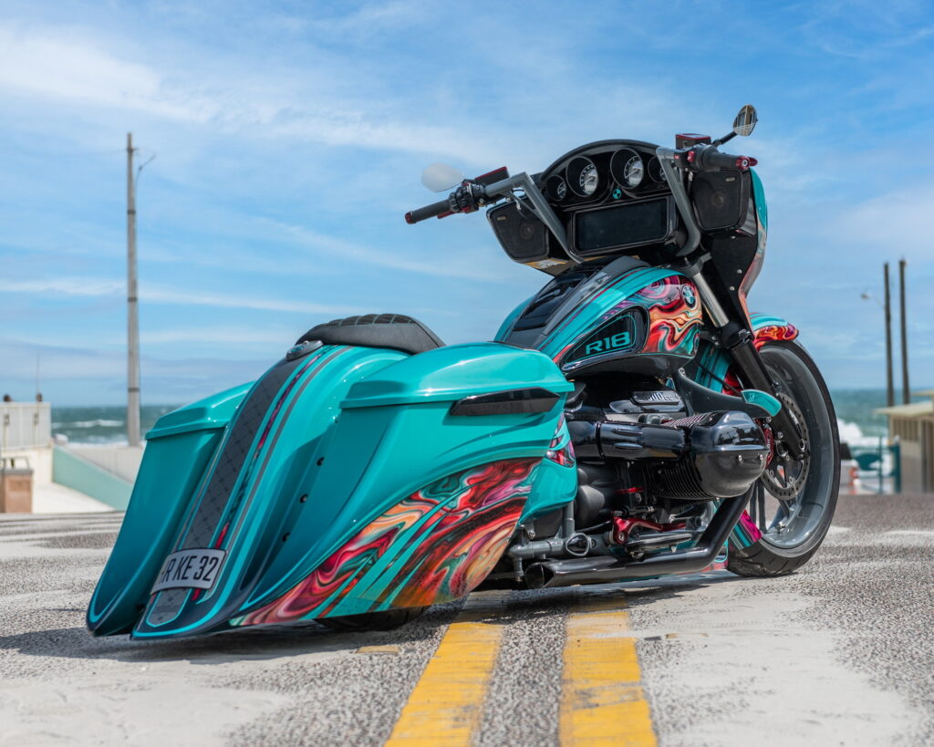 У передньому спойлері майстри встановили триколірну систему підсвічування. А корпус R 18 B Heavy Duty розфарбував тату майстер Марсель Сіннвелл. Тонка смужка — данина поваги 100-річному ювілею BMW Motorrad, а елементи тай-дай — натхненні спостереженням за змішуванням фарб.