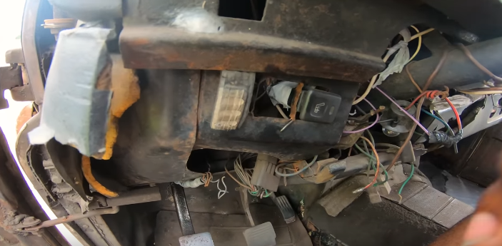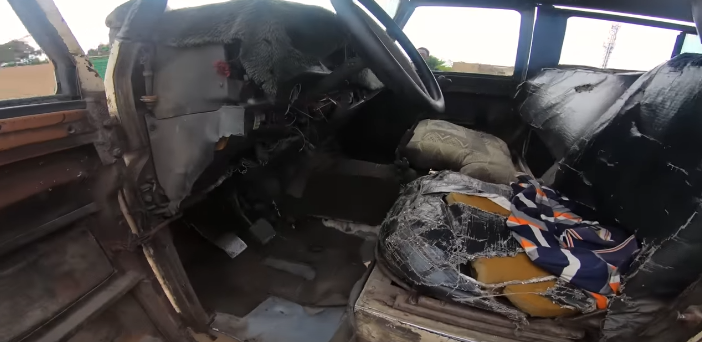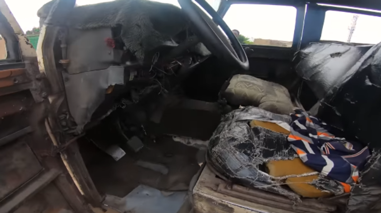 Кузов позашляховика весь прогнив. На ньому немає ні натяку на те, в який колір його було пофарбовано. Дверні ручки, колісні диски та інше облицювання повністю відсутні. Також частково немає бічного скла.