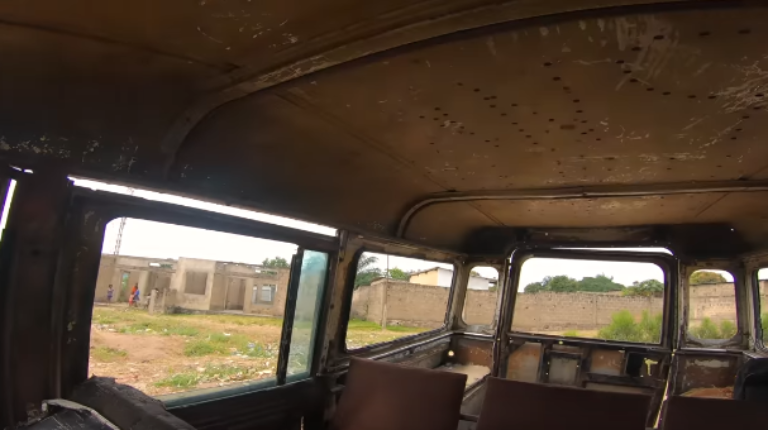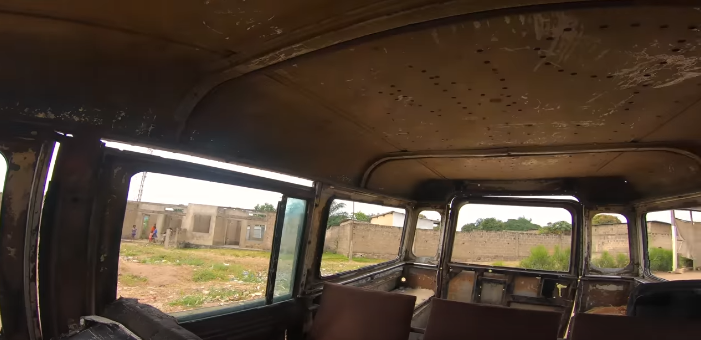 У салоні справи не кращі. Тут не працює жоден датчик, а дроти пучками стирчать з передньої панелі. На підлозі лежать металеві пластини, прикриваючи діри. Заводських сидінь немає. На їх місця встановили лавки і крісла з інших машин. Про обшивку навіть не йдеться. Загальний вигляд у Land Rover Defender такий, ніби він є експонатом до фільму про апокаліпсис.