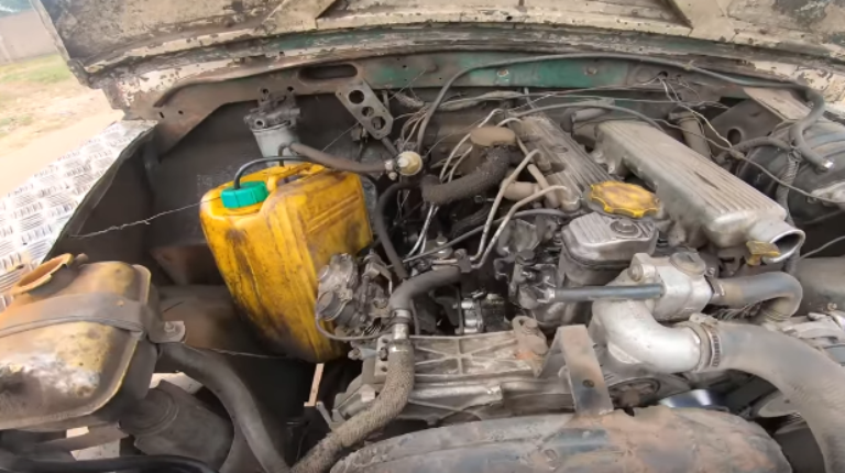 Заглянувши під капот автомобіля, можна побачити, що паливного бака в його оснащенні також немає, а пальне заливається в каністру, встановлену поруч з мотором. Вузли і агрегати — в не менш жалюгідному стані.