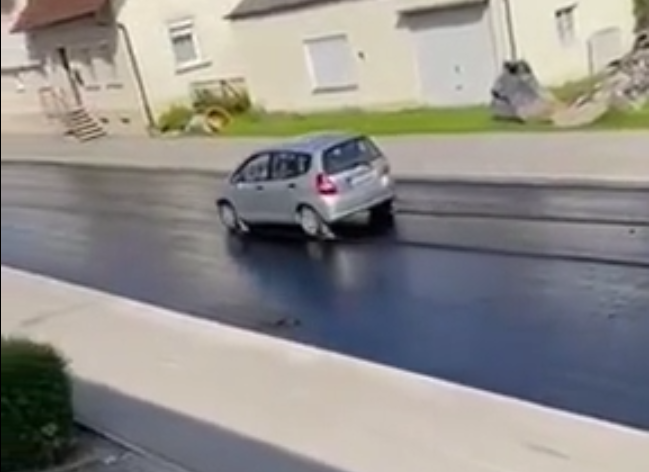 Однак бувають і більш критичні ситуації. Наприклад, водій хетчбека Honda Jazz прокотився дорогою, на яку тільки-но нанесли фінальний шар асфальту. Покриття навіть не встигло охолонути. В результаті, автомобіль своїми колесами вирізав на дорозі глибокі колії і ледь не загруз у них. Тепер цю ділянку дорожникам доведеться знову ремонтувати, оскільки відновити її не вийде.