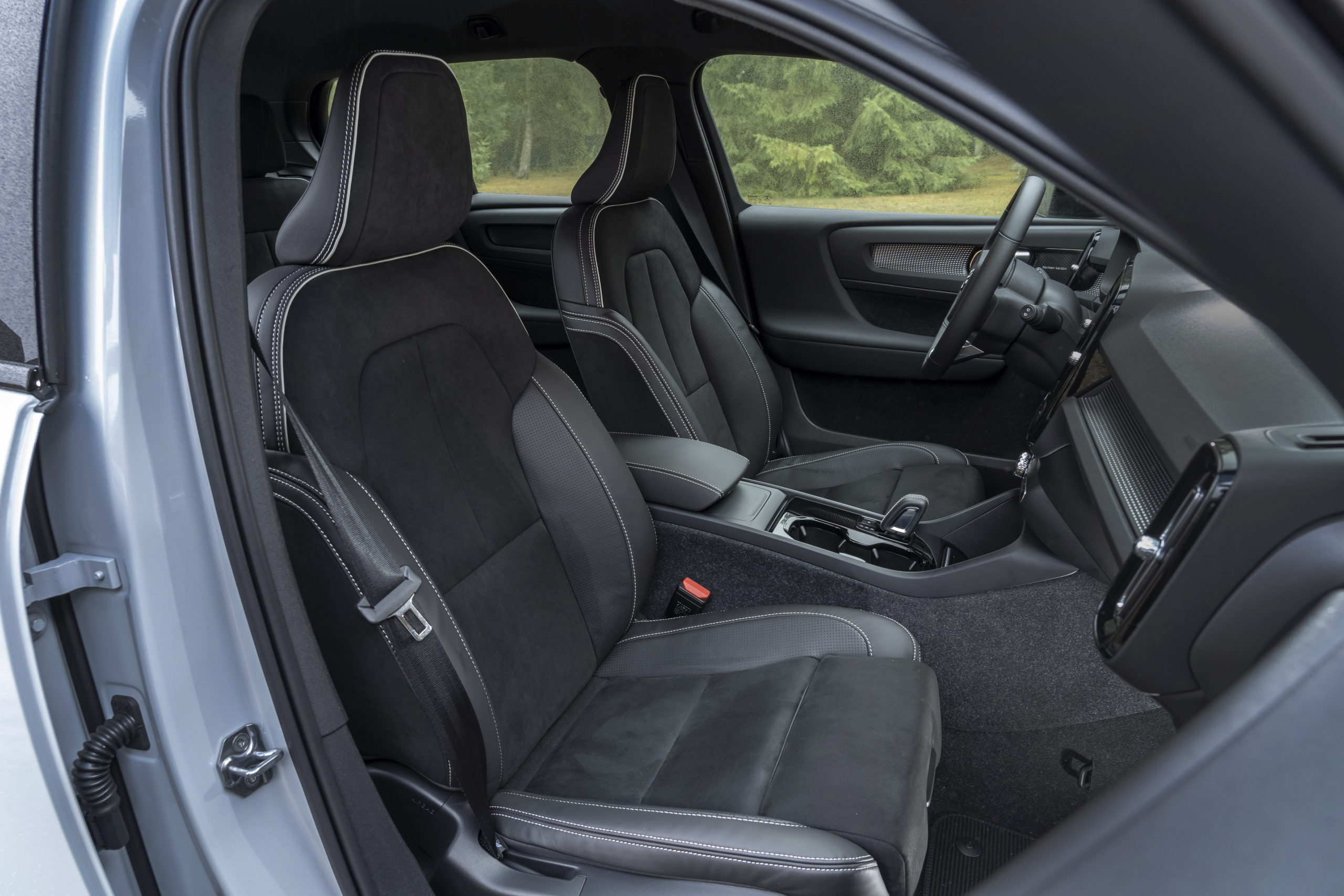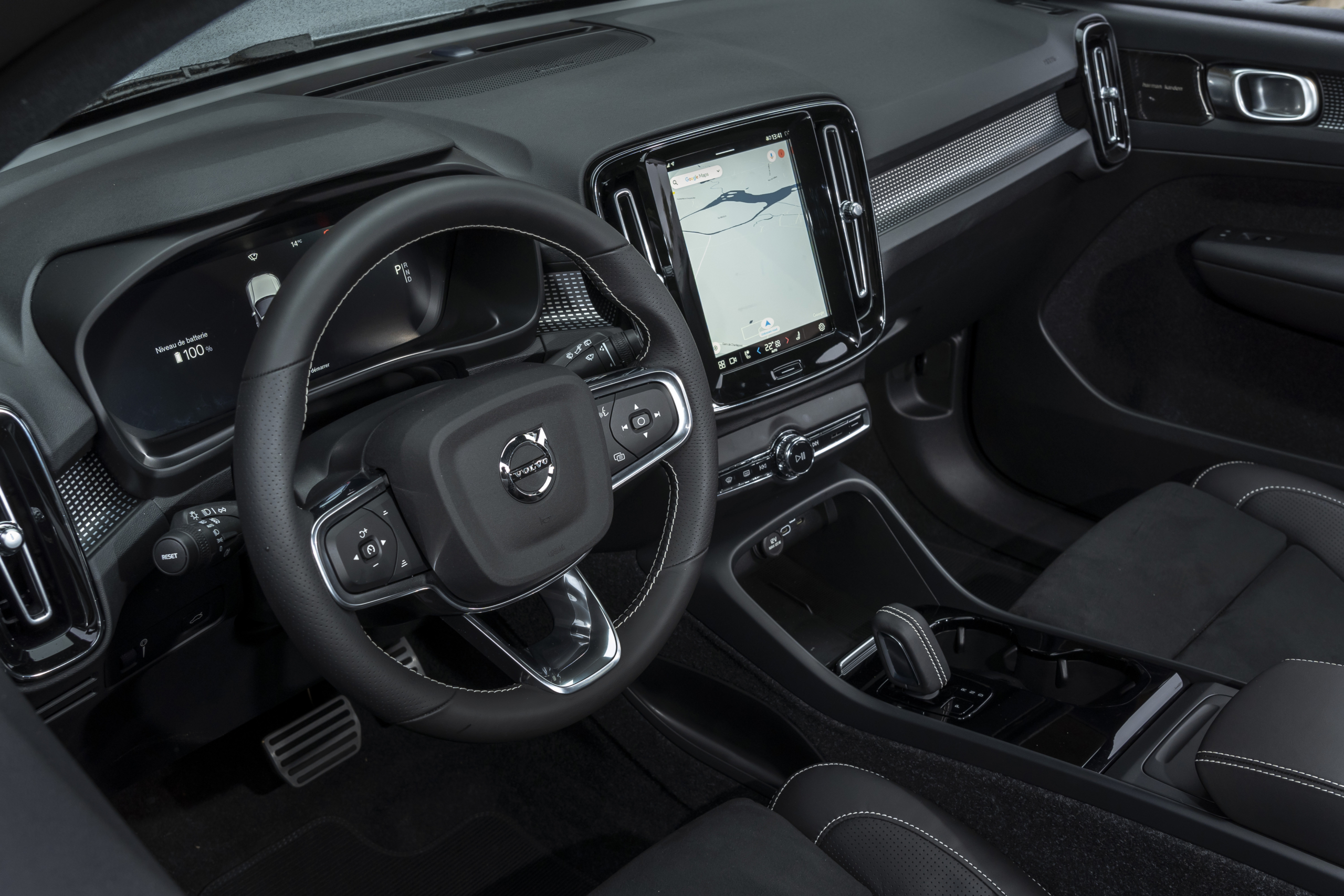На цьому, мабуть, видимі відмінності електромобіля XC40 від XC40 з ДВЗ закінчуються. У салоні вже знайома нам архітектура передньої панелі, сидіння з комбінованою оббивкою (алькантара+шкіра) і вертикальний дисплей мультимедійної системи. Вже знайома нам інформаційно-розважальна система тут працює на базі Android і має вбудовані сервіси Google. Всі звичні нам додатки вже є в автомобілі, і для користування ними навіть смартфон не потрібен. Так, наприклад, навігація використовує карти Google, а завантажити додатковий додаток можна за допомогою Google Plaу. Інтерфейс дуже схожий на той, який був раніше, тому завдяки продуманій логіці користуватися всім легко. Досить прогресивно! До слова, таку ж мультимедіа почнуть встановлювати і на інші моделі Volvo (XC60, S90, V90) 2022 модельного року.