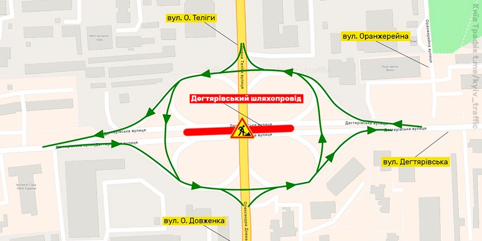 З 13 червня проїзд Дегтярівським шляхопроводом буде закритий. Як повідомила пресс-служба мерії, обмеження повязано з початком ремонтних робіт. Розвязка навколо шляхопроводу працюватиме за принципом турбіни. Проїзд забеспечать у всіх напрямках. Рух регулюватимуть тимчасові світлофори.