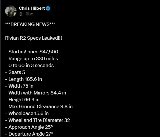 Офіційну прем'єру нового електричного позашляховика Rivian R2 заплановано на 7 березня. Однак утримати новинку в секреті компанії не вдалося. У мережу витекли її характеристики.