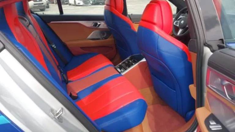 Салон автомобіля оздоблений натуральною шкірою кількох кольорів, включаючи королівський синій та два тони червоного. Також є коричнева шкіра на дверях, чорна шкіра на панелі приладів та червоно-коричневі килимки на підлозі. Як зазначається, на момент аварії цей BMW 8 X Jeff Koons встиг наїздити лише 17,7 км.