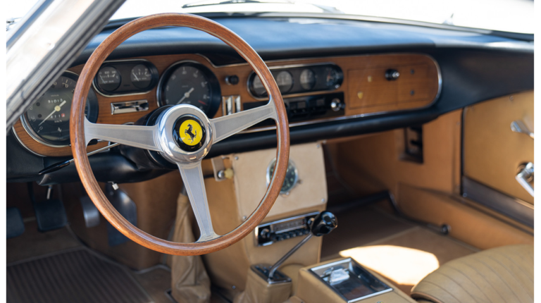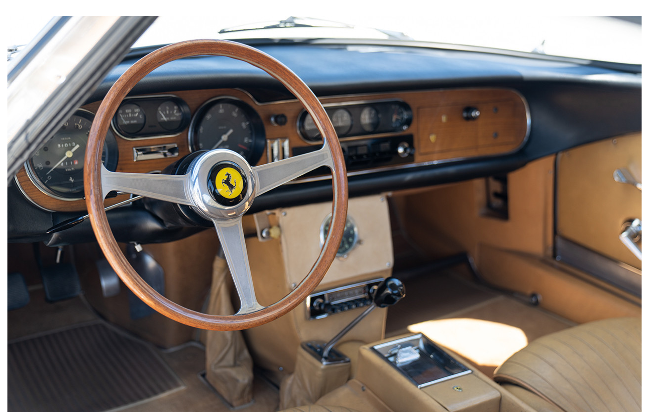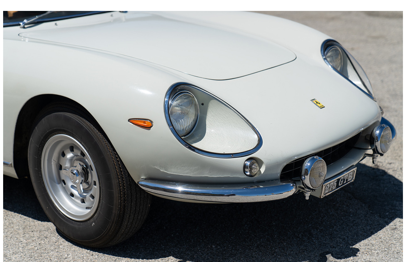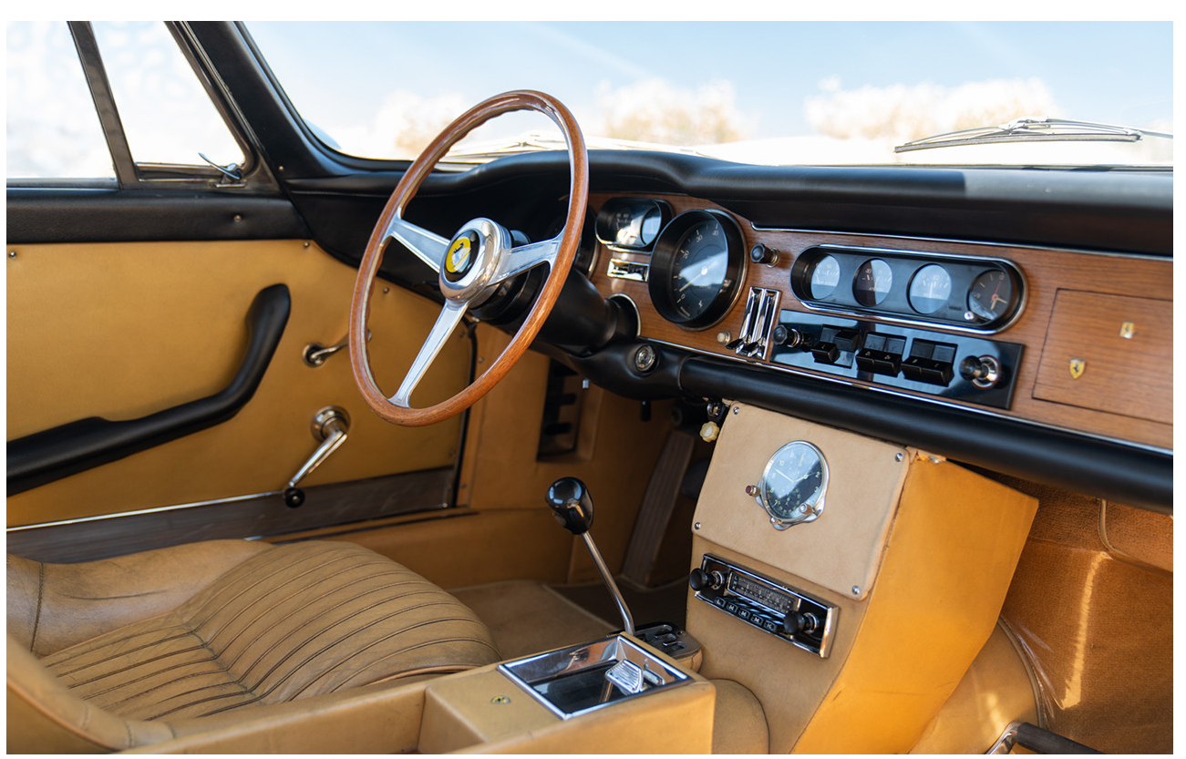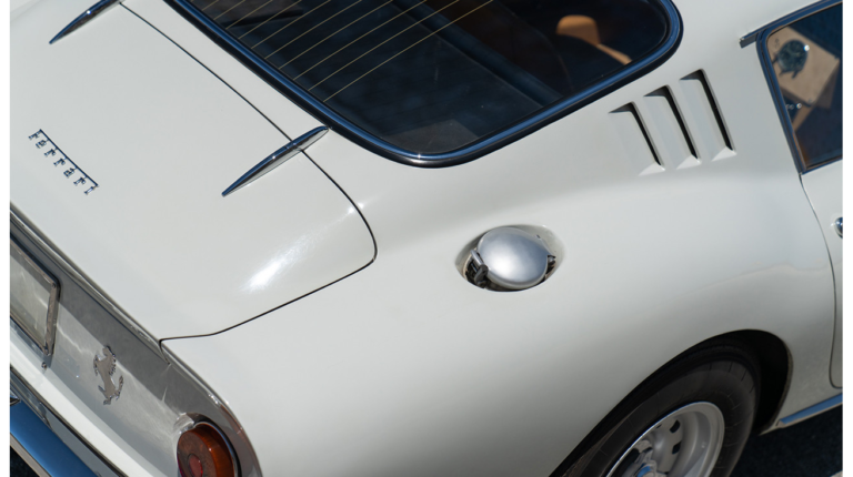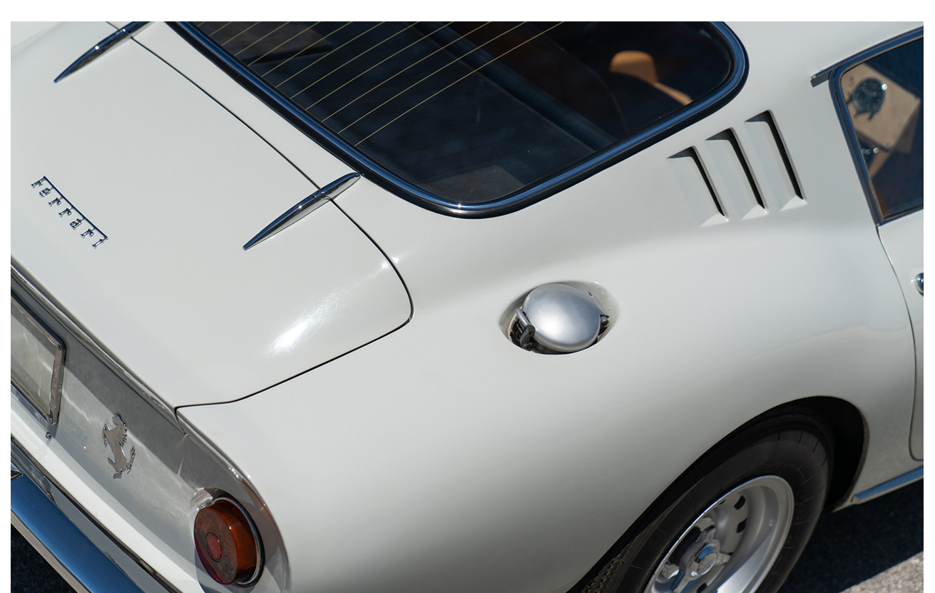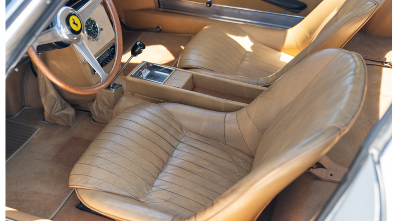 Автомобиль окрашен в уникальный белый цвет Bianco. Особое очарование ему придают элегантные фары Marchal и хромированный шильдик марки в форме гарцующей лошади. Салон старой Феррари отделан бежевой кожей, которая выглядит превосходно, а в оснащение вошли радио Blaupunkt и хронограф Jaeger-LeCoultre. Вместе с автомобилем покупатель получил два комплекта колес, оригинальное руководство пользователя и заводские брошюры, а также различные запасные части и набор оригинальных инструментов.